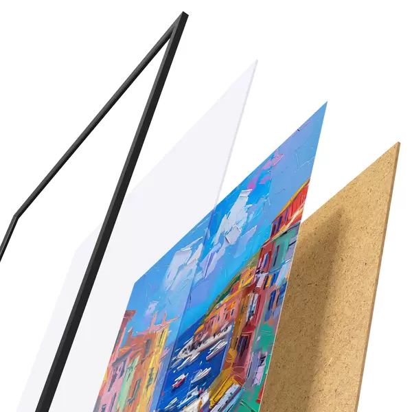 Il poster è composto da cornice, plexiglass, immagine stampata e supporto in truciolato. Il poster può essere immediatamente appeso alla parete grazie ai supporti sul retro.