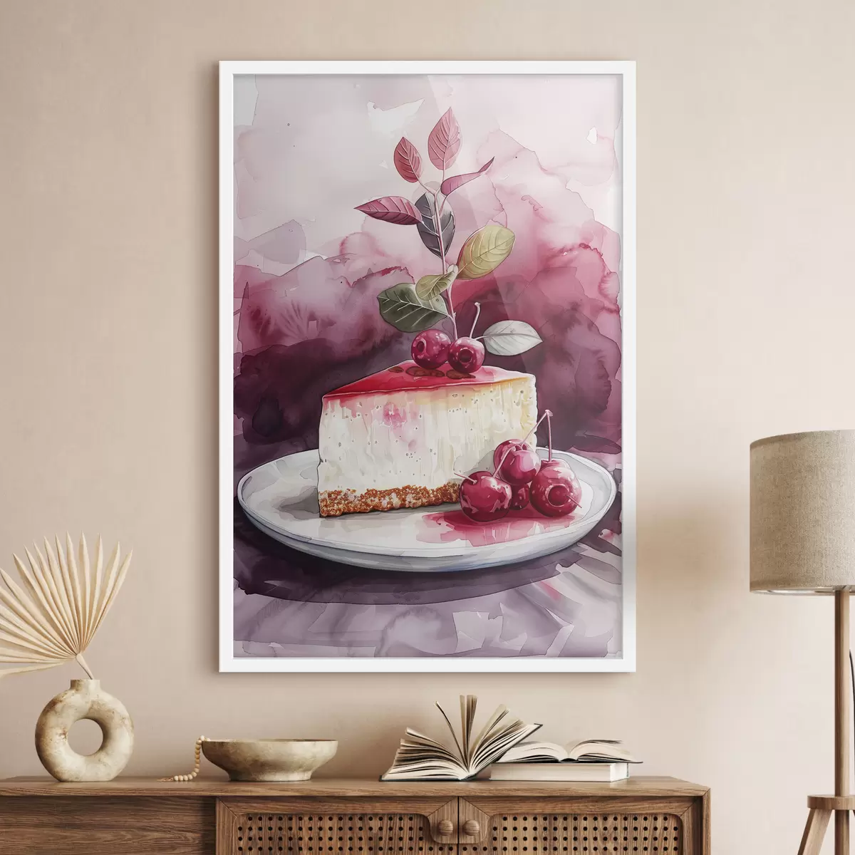 Poster Cheesecake all'acquerello con ciliegie, elegante arte culinaria, colori rosso e viola Nr f39700