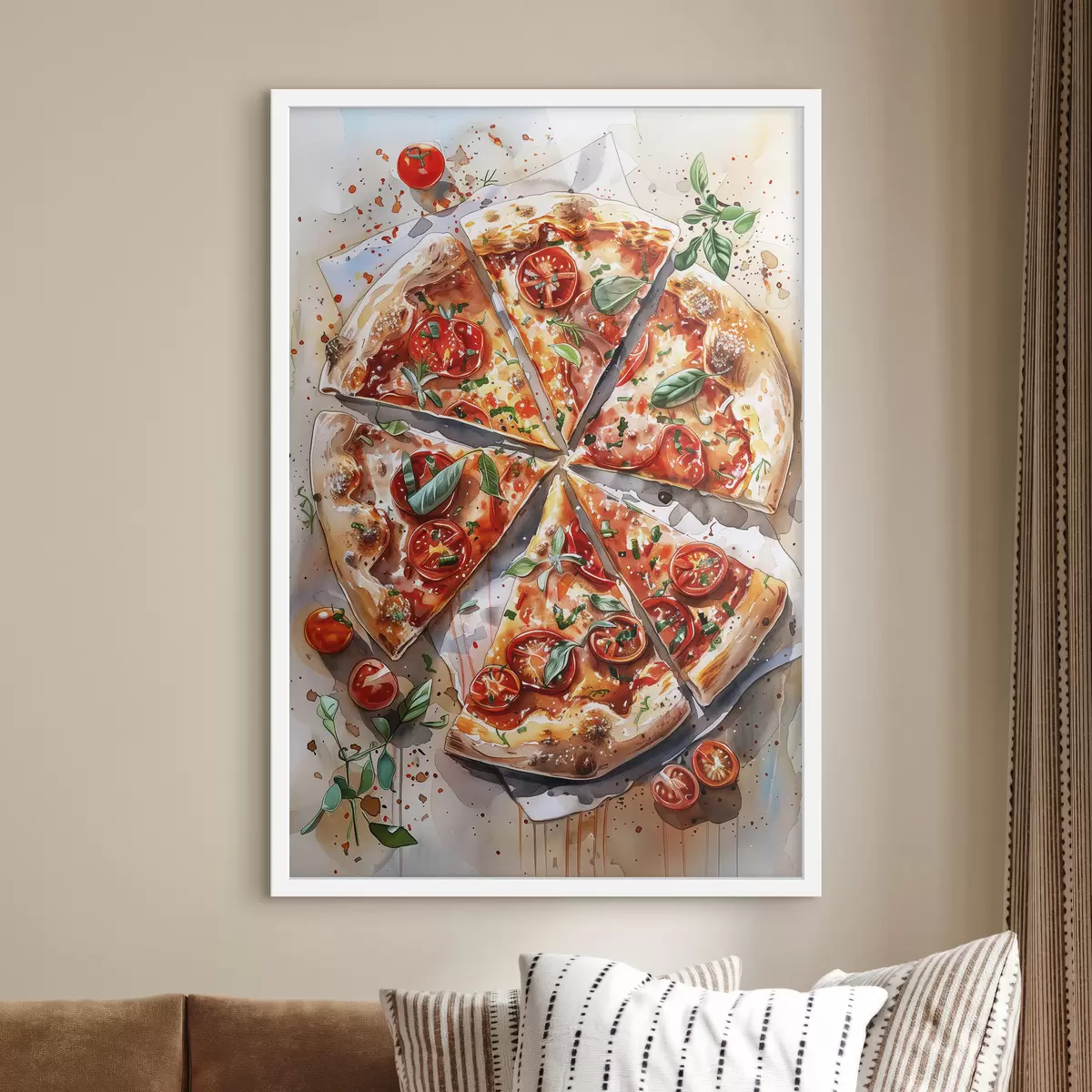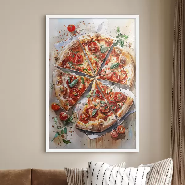 Poster Pizza acquerello, deliziosa, pomodori e formaggio, arte alimentare, tavolo in legno f39704