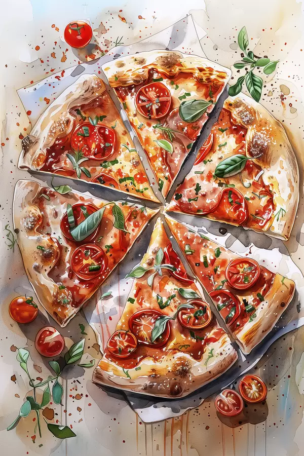 Poster Pizza acquerello, deliziosa, pomodori e formaggio, arte alimentare, tavolo in legno f39704