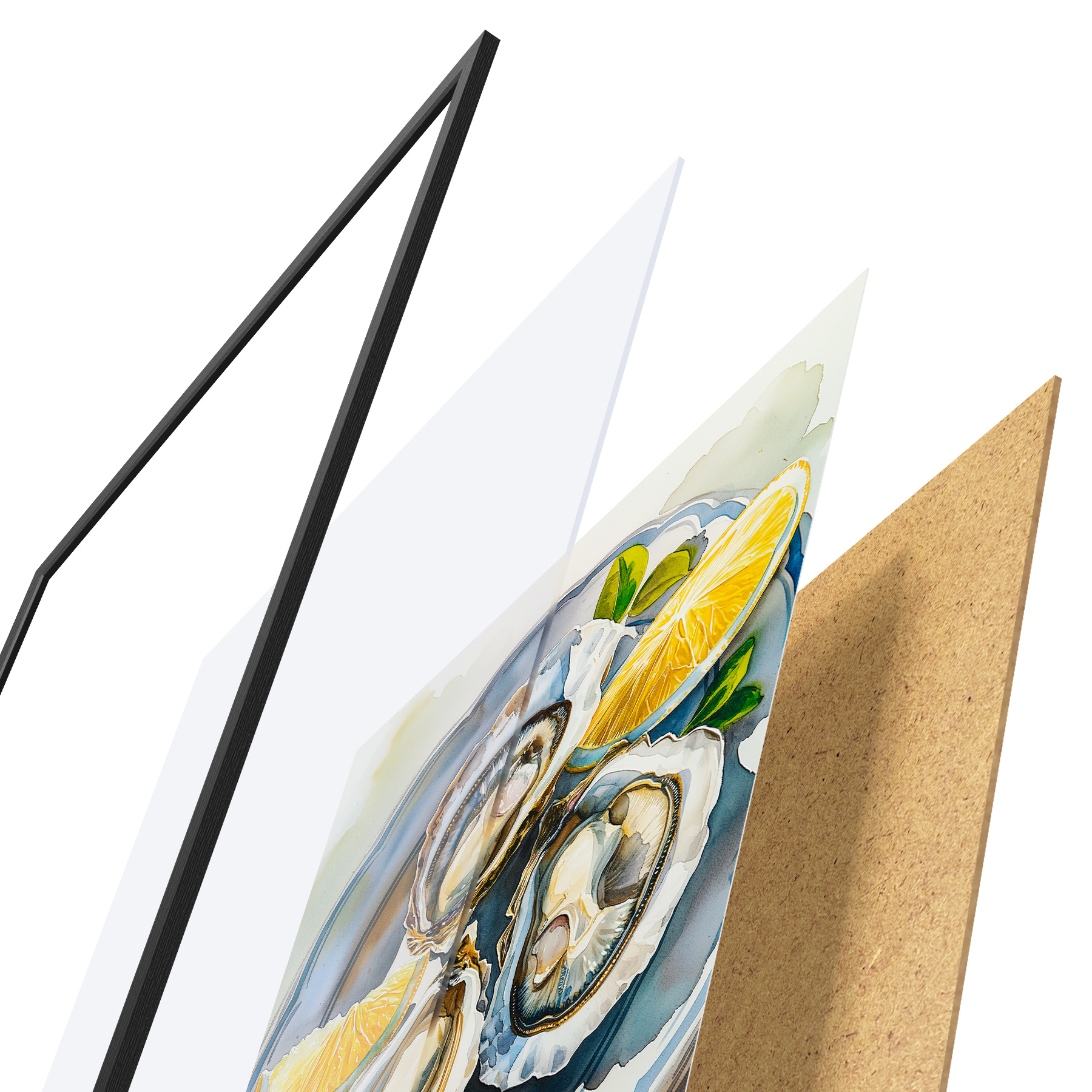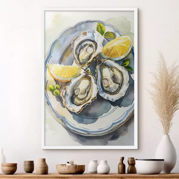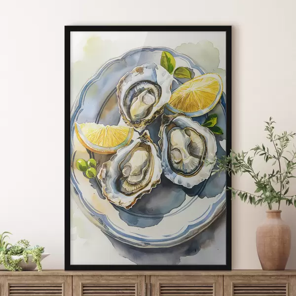 Poster Ostriche eleganti sul piatto, acquerello, limoni, colori naturali, mediterranei f39711