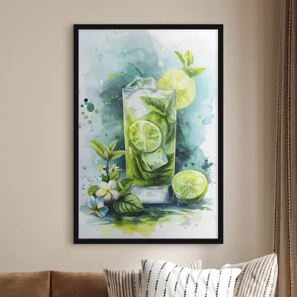 Poster Cocktail estivo acquerello, mojito, lime e menta, colori floreali e verdi f39712