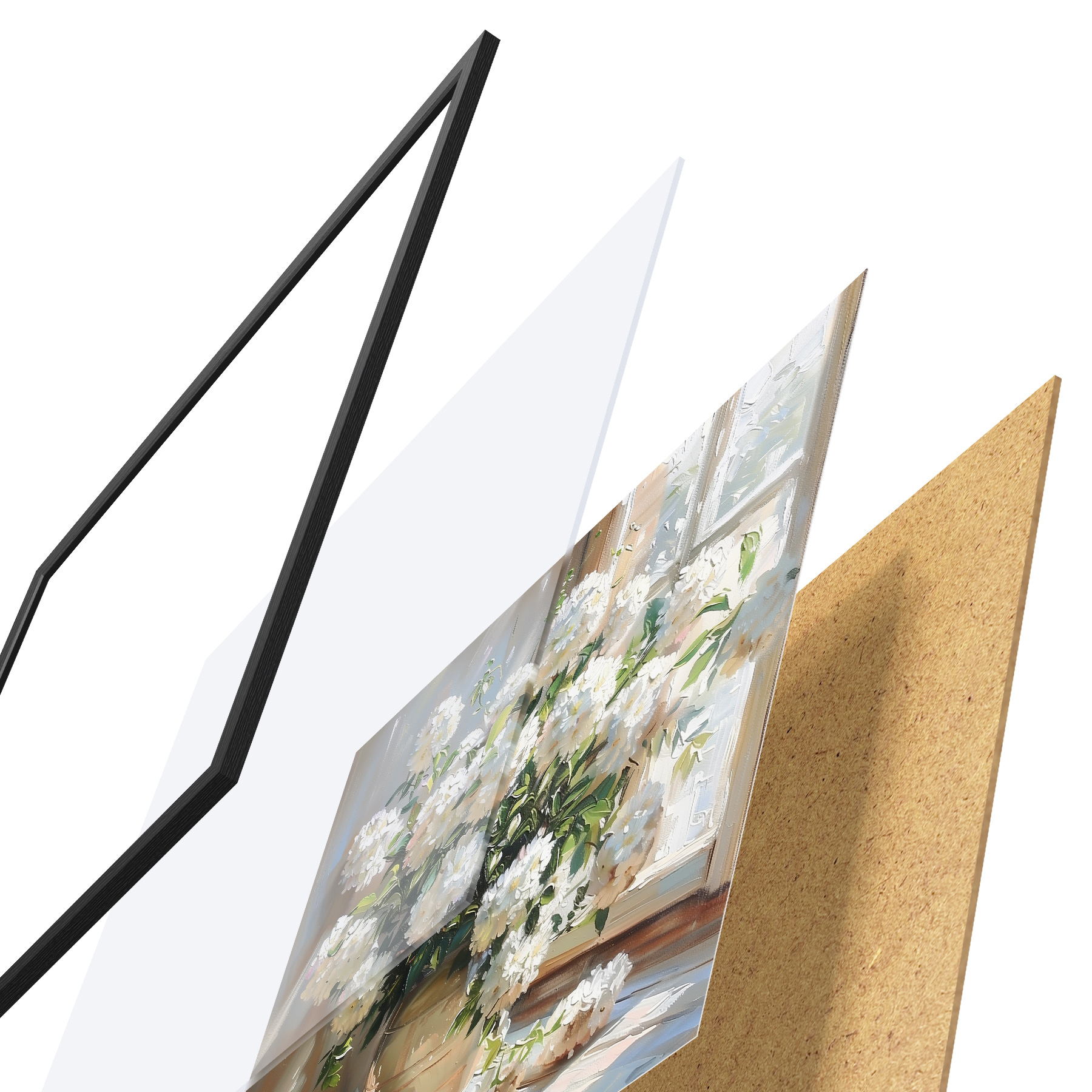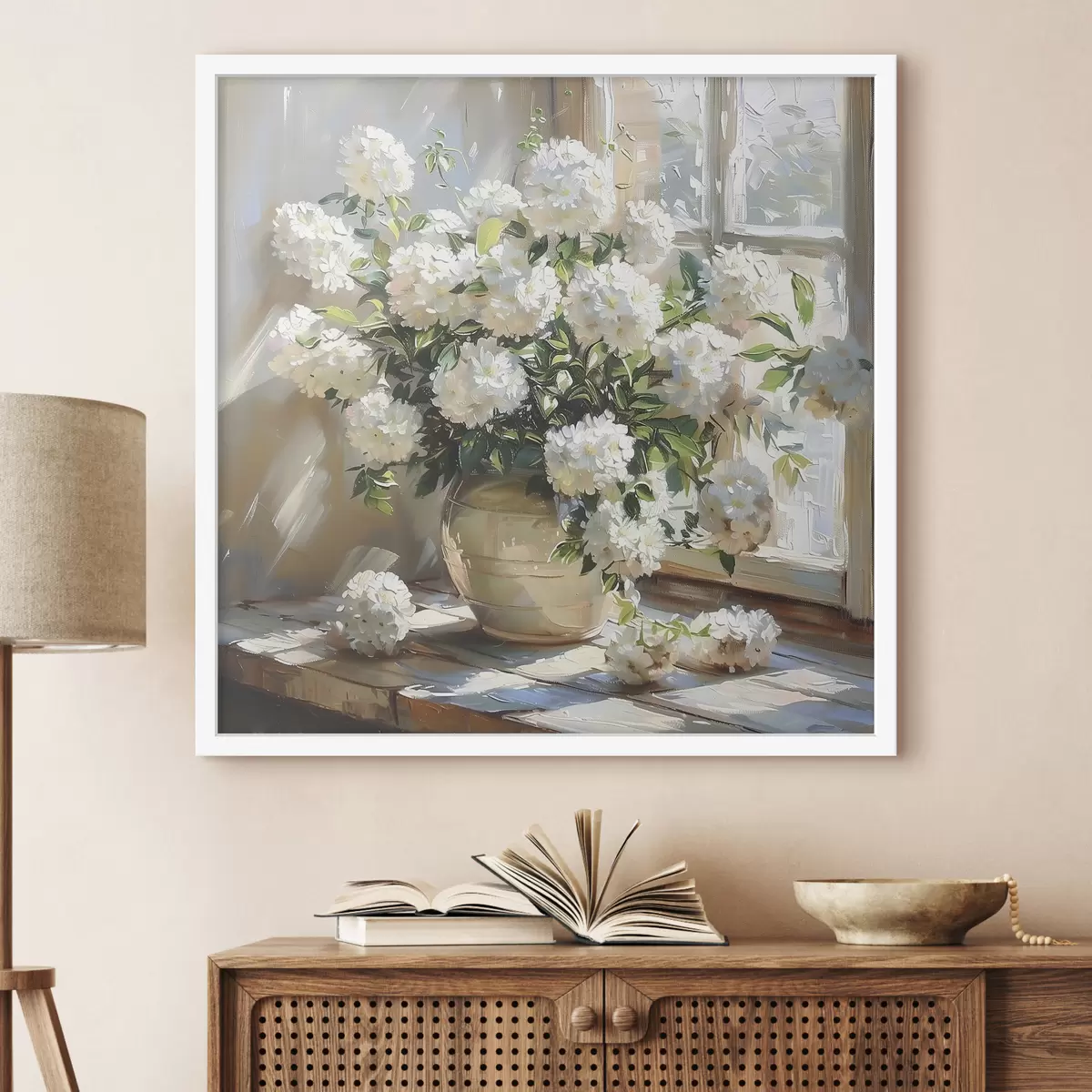 Poster Ortensie bianche nel vaso, luce del sole nella finestra, pittura a olio Nr f39779