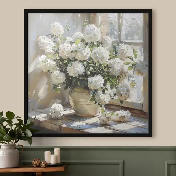 Poster Ortensie bianche nel vaso, luce del sole nella finestra, pittura a olio f39779