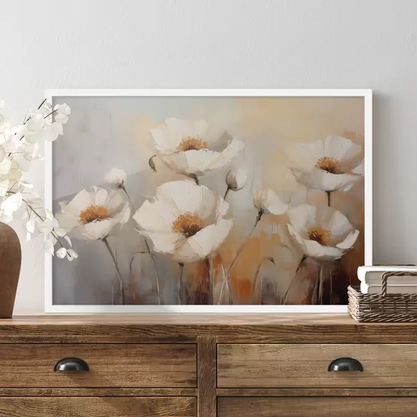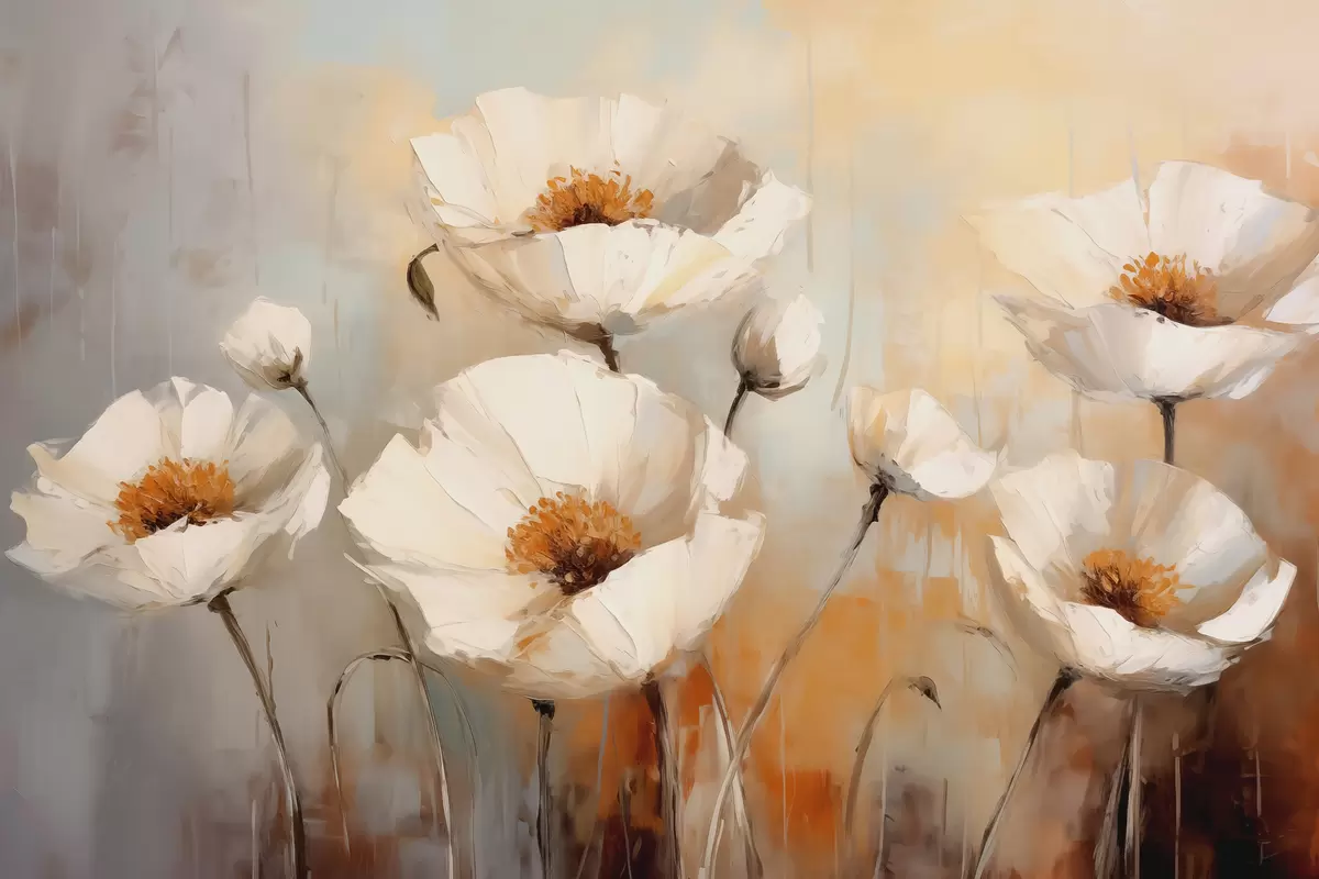 Poster Dipinto ad olio papaveri bianchi, colore blu e arancione Nr f39815