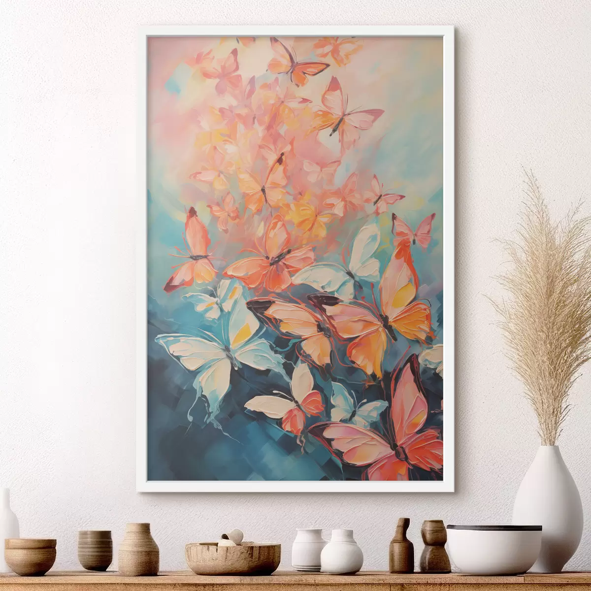 Poster Uno stormo di farfalle che volano su un dipinto ad olio blu f39922
