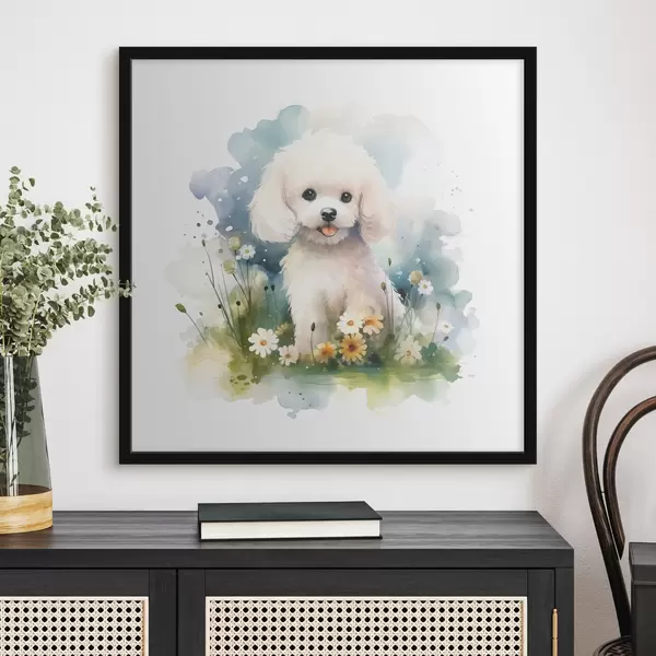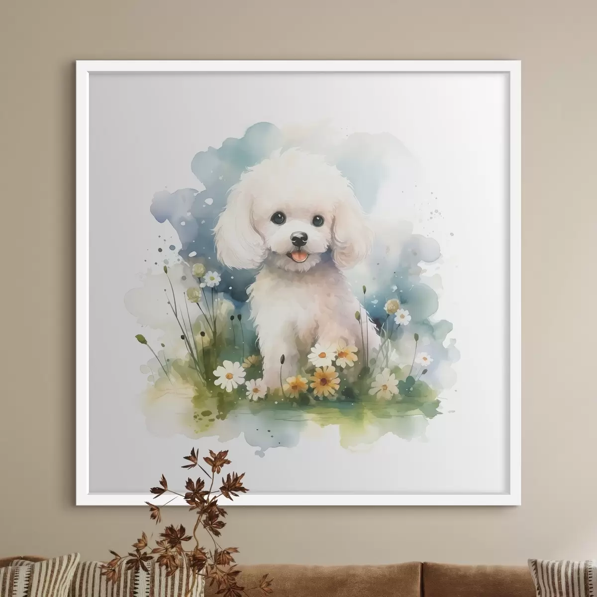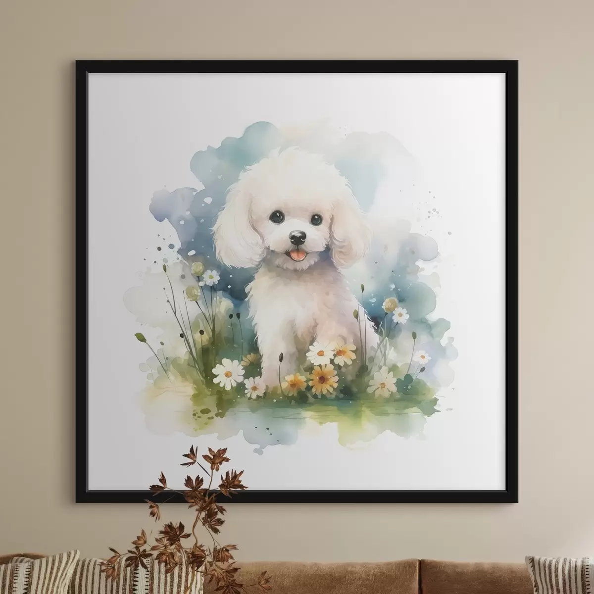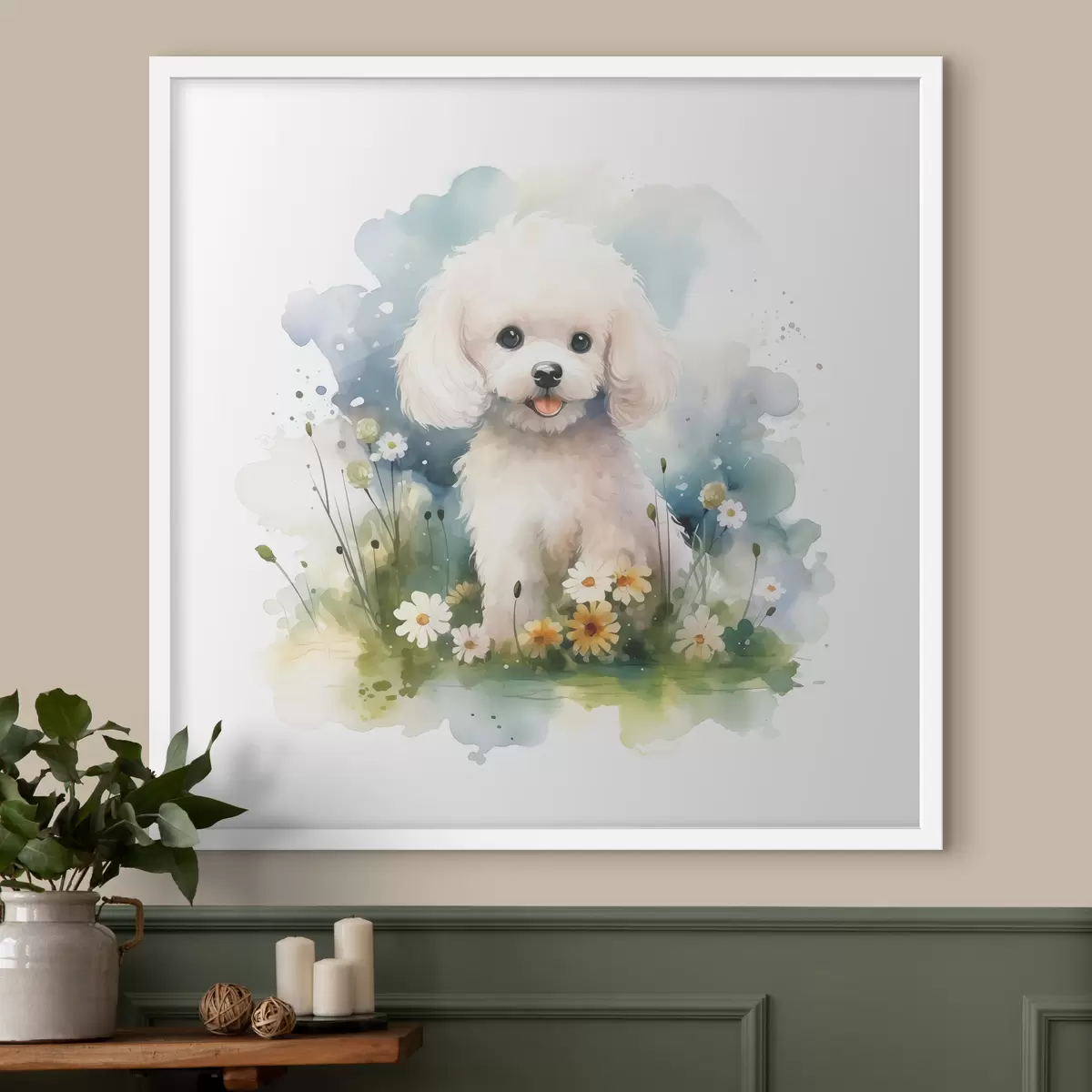 Poster Piccolo barboncino bianco seduto in un acquerello di fiori f39928