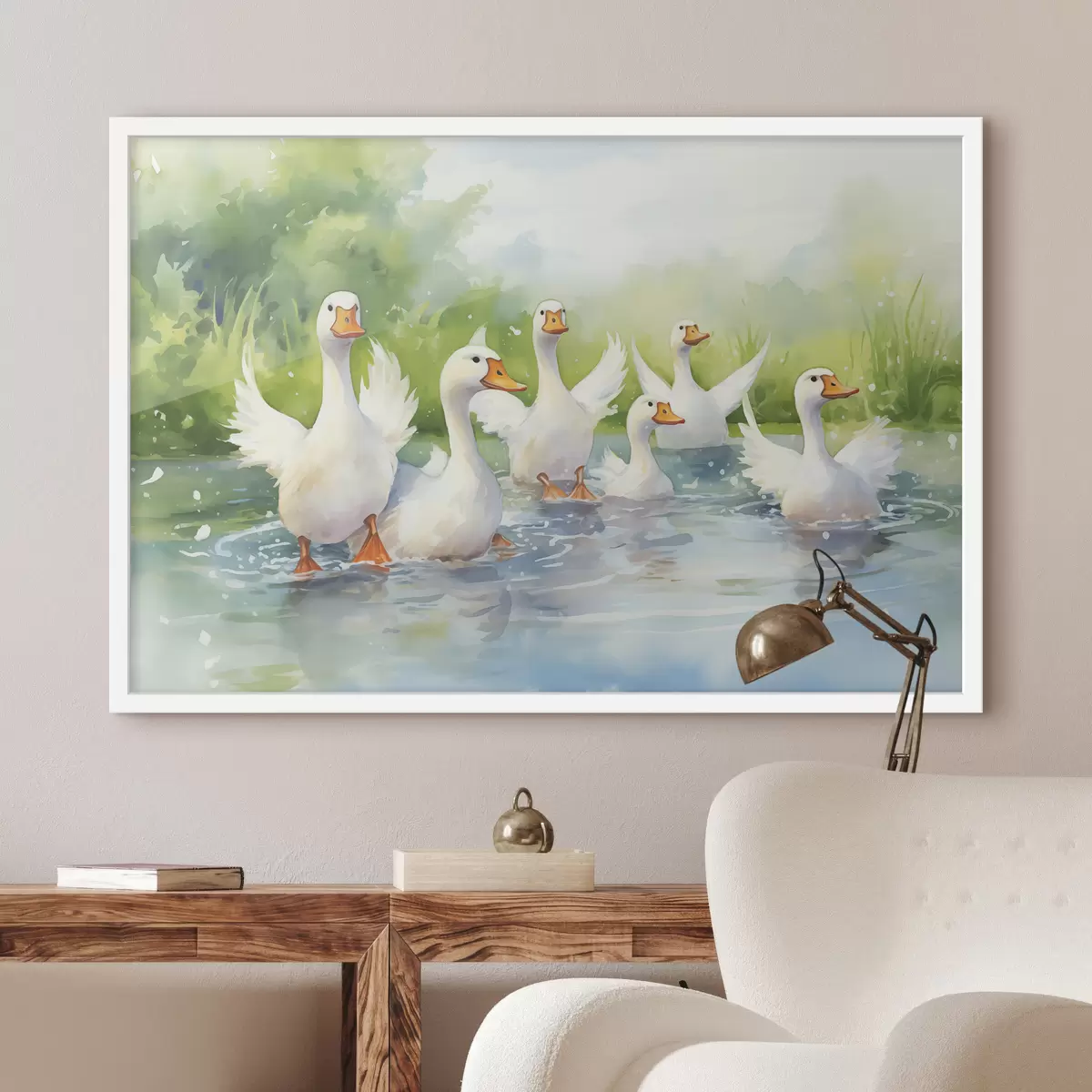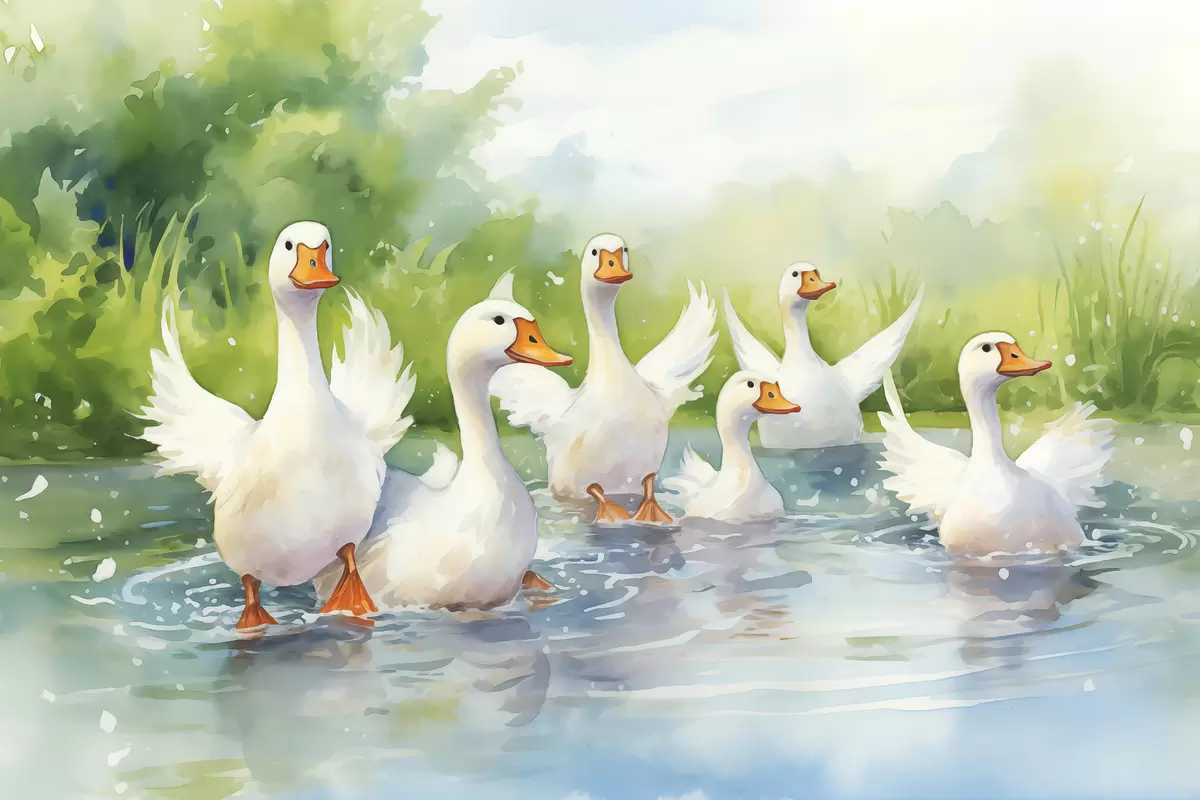 Poster Oche bianche che fanno il bagno in uno stagno dipinto ad acquerello Nr f39939