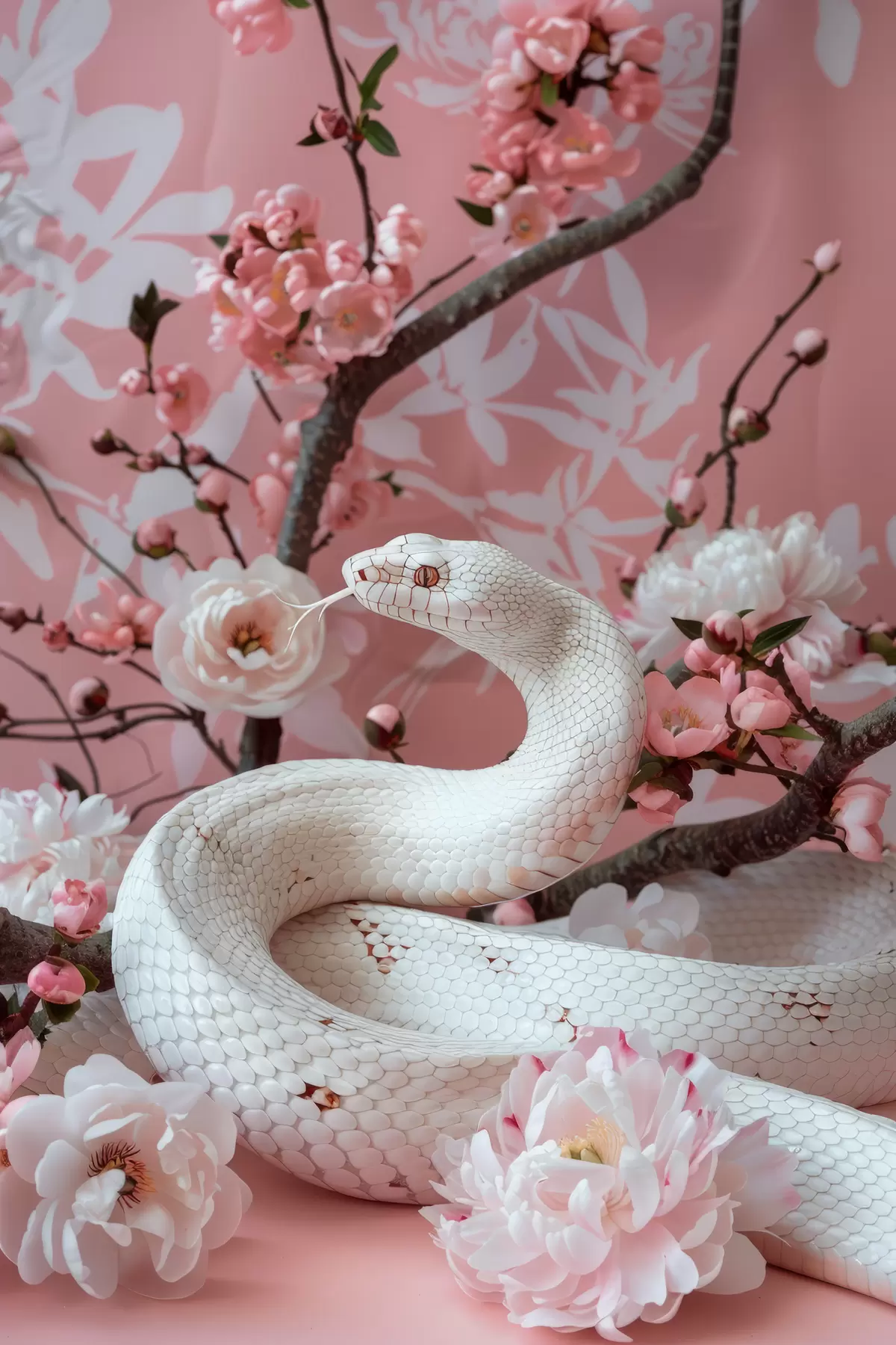 Poster Serpente bianco e fiori rosa f39941