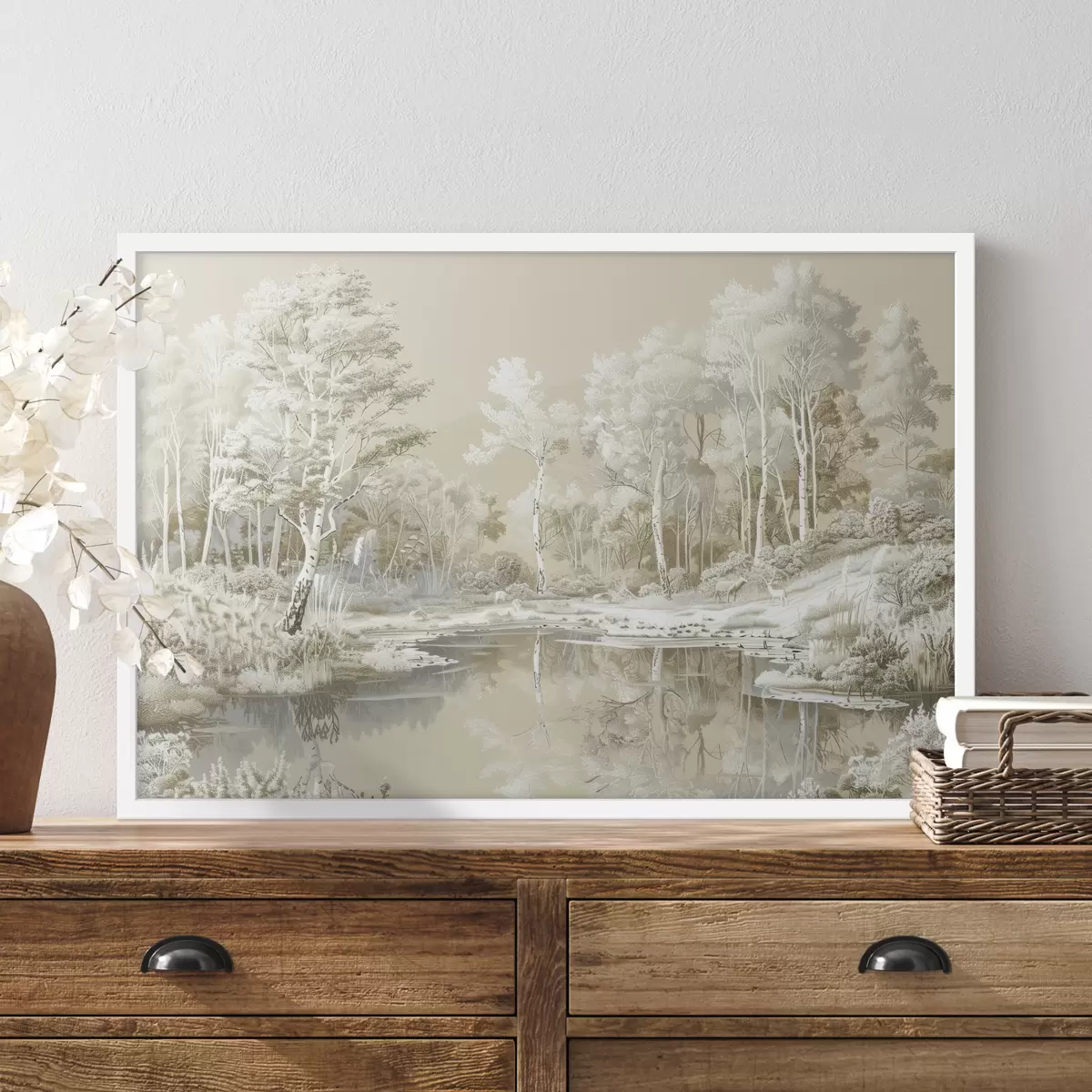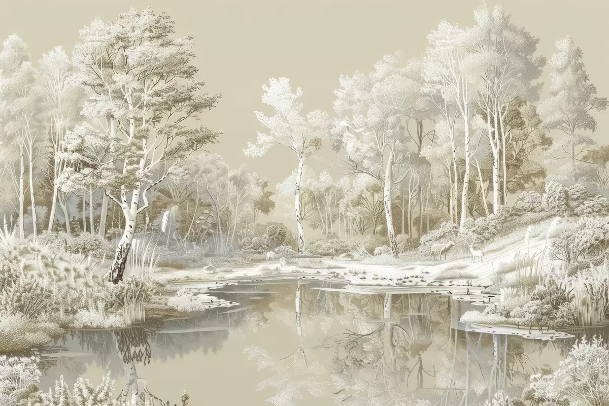 Poster Bellissimo paesaggio forestale, stagno e alberi, colori beige e bianco Nr f39979