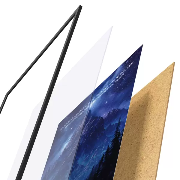 Il poster è composto da cornice, plexiglass, immagine stampata e supporto in truciolato. Il poster può essere immediatamente appeso alla parete grazie ai supporti sul retro.