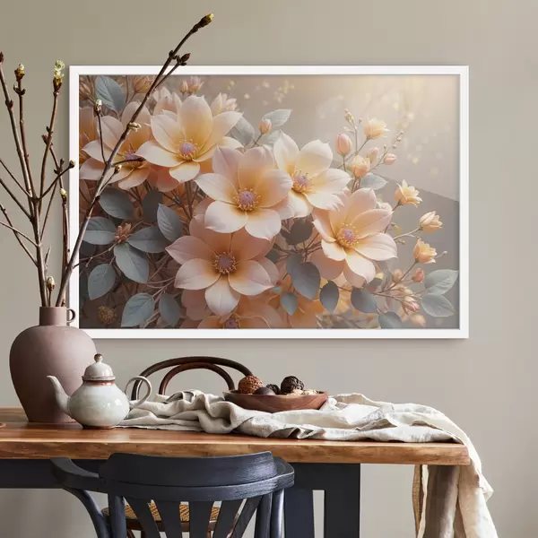 Poster Delicati fiori di dalia color pesca in piena fioritura, con morbidi petali su uno sfondo sfocato Nr f40024
