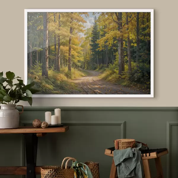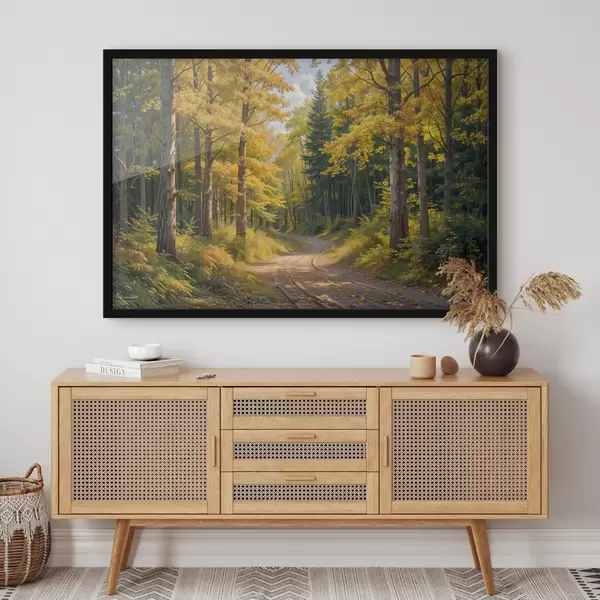 Poster Una strada sterrata che serpeggia attraverso una foresta in autunno, con alberi alti su entrambi i lati Nr f40031