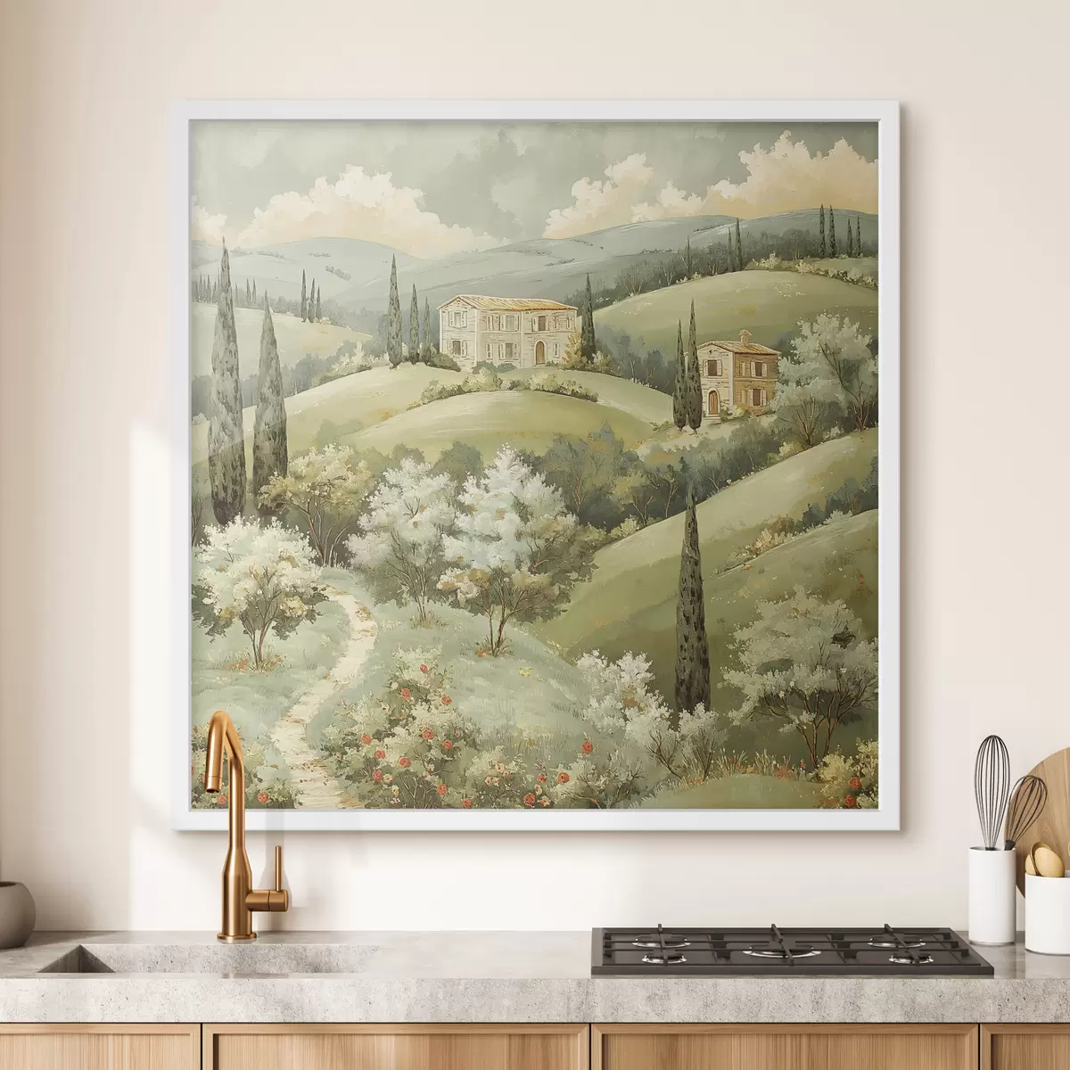 Poster Paesaggio con case d'epoca, colori verde pastello, disegno acrilico, estate Nr f40078
