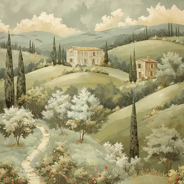 Poster Paesaggio con case d'epoca, colori verde pastello, disegno acrilico, estate f40078