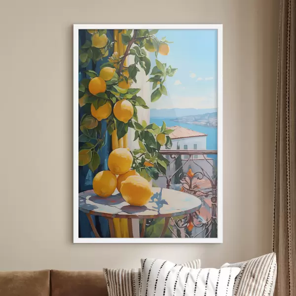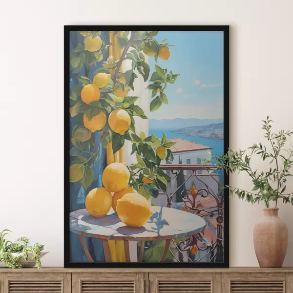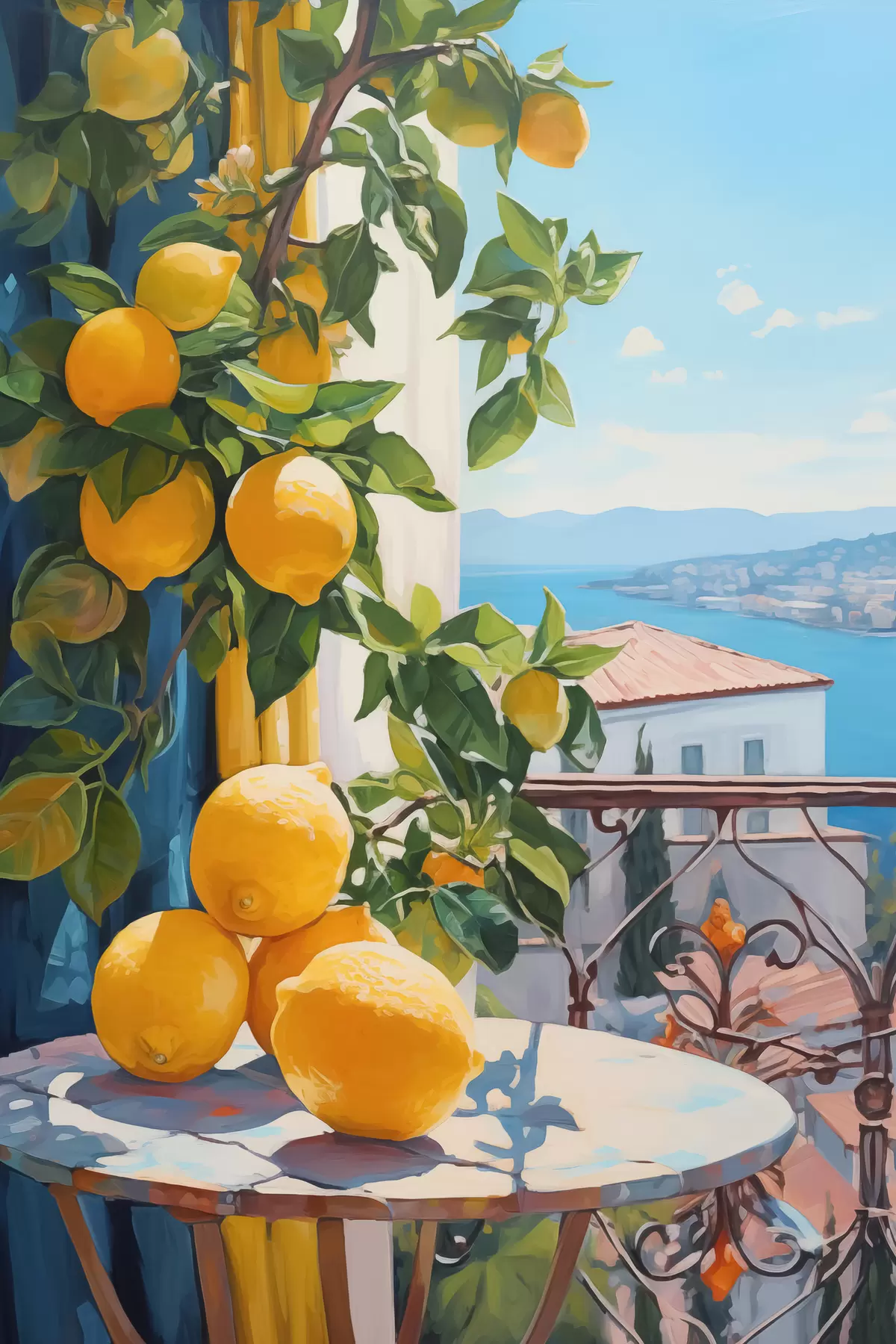 Poster Limoni su albero e tavolo sul balcone dell'hotel con vista mare imitazione pittura a olio Nr f40091