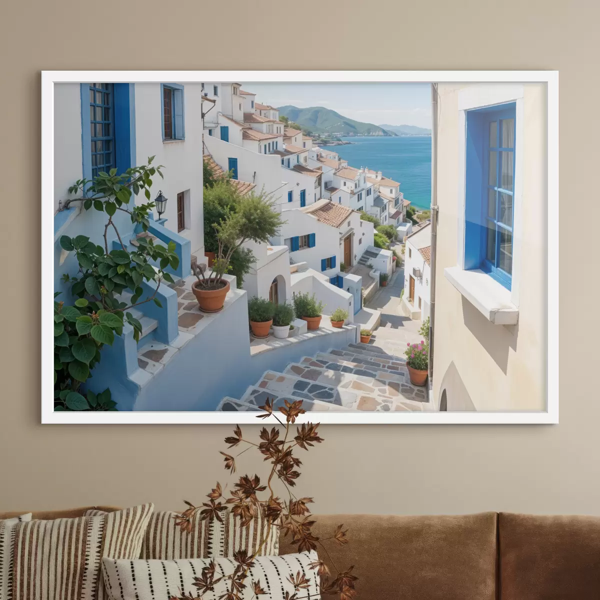 Poster Una pittoresca cittadina costiera con edifici bianchi, finestre blu e piante in vaso che costeggiano le strette vie Nr f40148