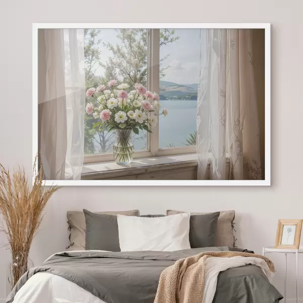 Poster Un bouquet di fiori rosa e bianchi in un vaso di vetro posto sul davanzale di una finestra, con un lago panoramico e montagne Nr f40151