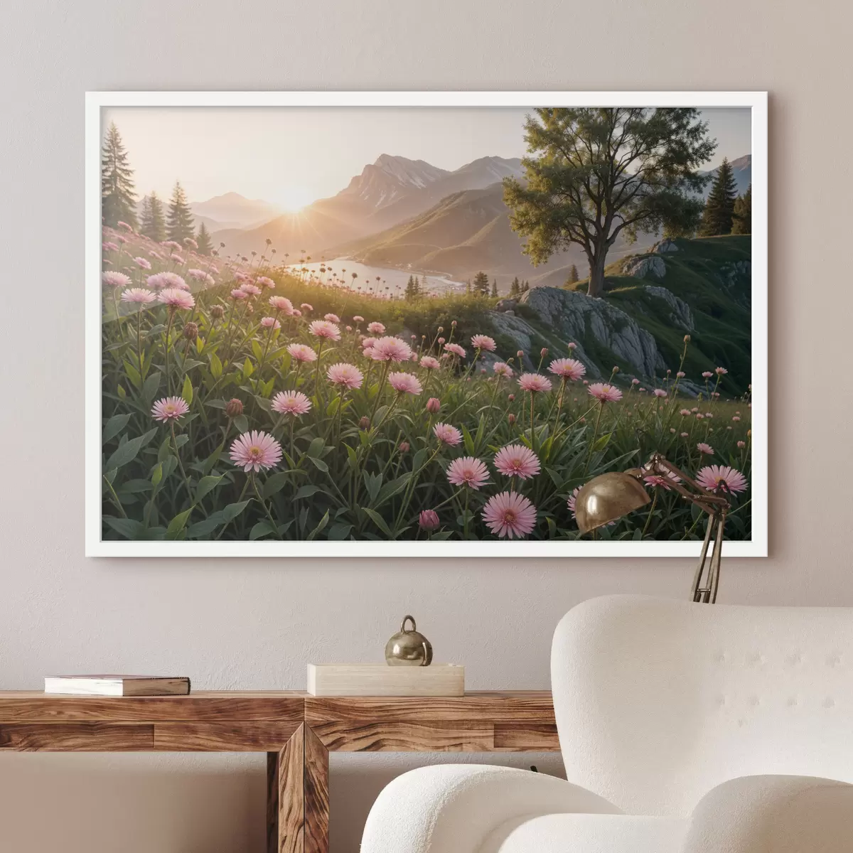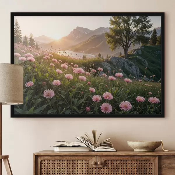 Poster Un campo di fiori rosa simili a margherite in primo piano, con una grande catena montuosa sullo sfondo Nr f40154