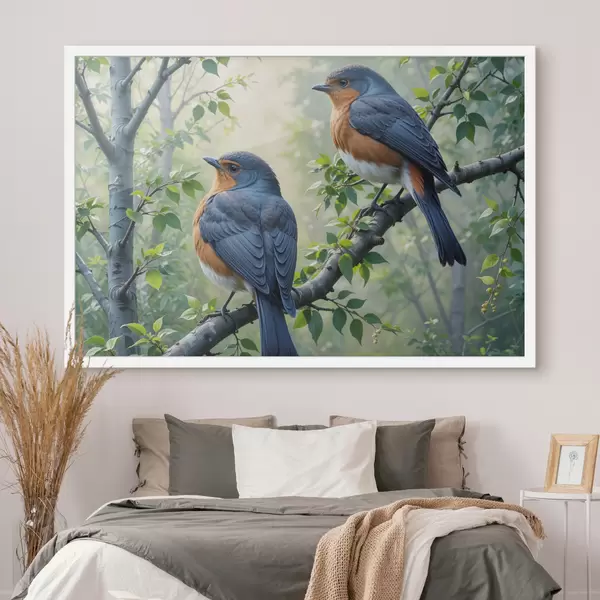 Poster Due uccelli blu e arancioni appollaiati su un ramo di un albero con foglie verdi sullo sfondo Nr f40156