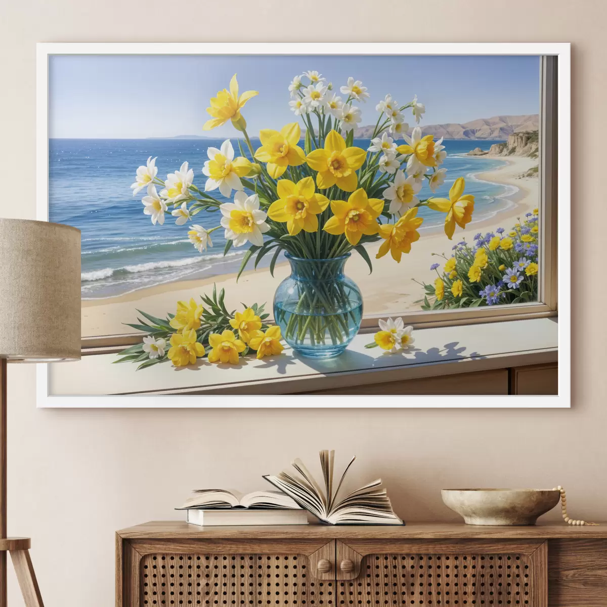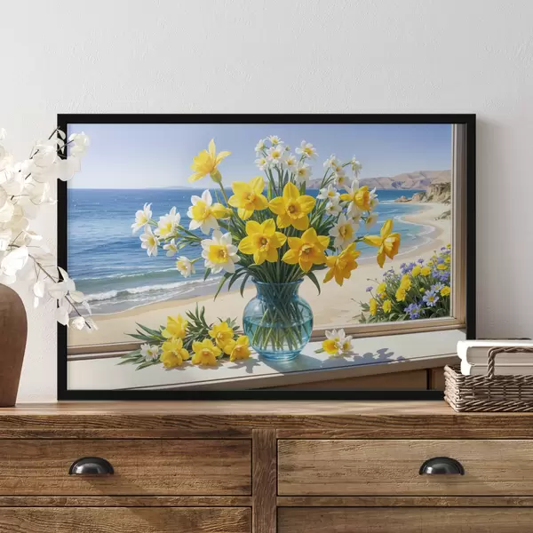 Poster Un mazzo di narcisi gialli e margherite bianche in un vaso di vetro su un davanzale con vista sulla spiaggia e sull'oceano Nr f40171