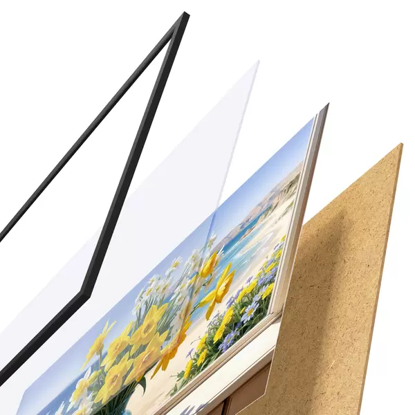 Il poster è composto da cornice, plexiglass, immagine stampata e supporto in truciolato. Il poster può essere immediatamente appeso alla parete grazie ai supporti sul retro.
