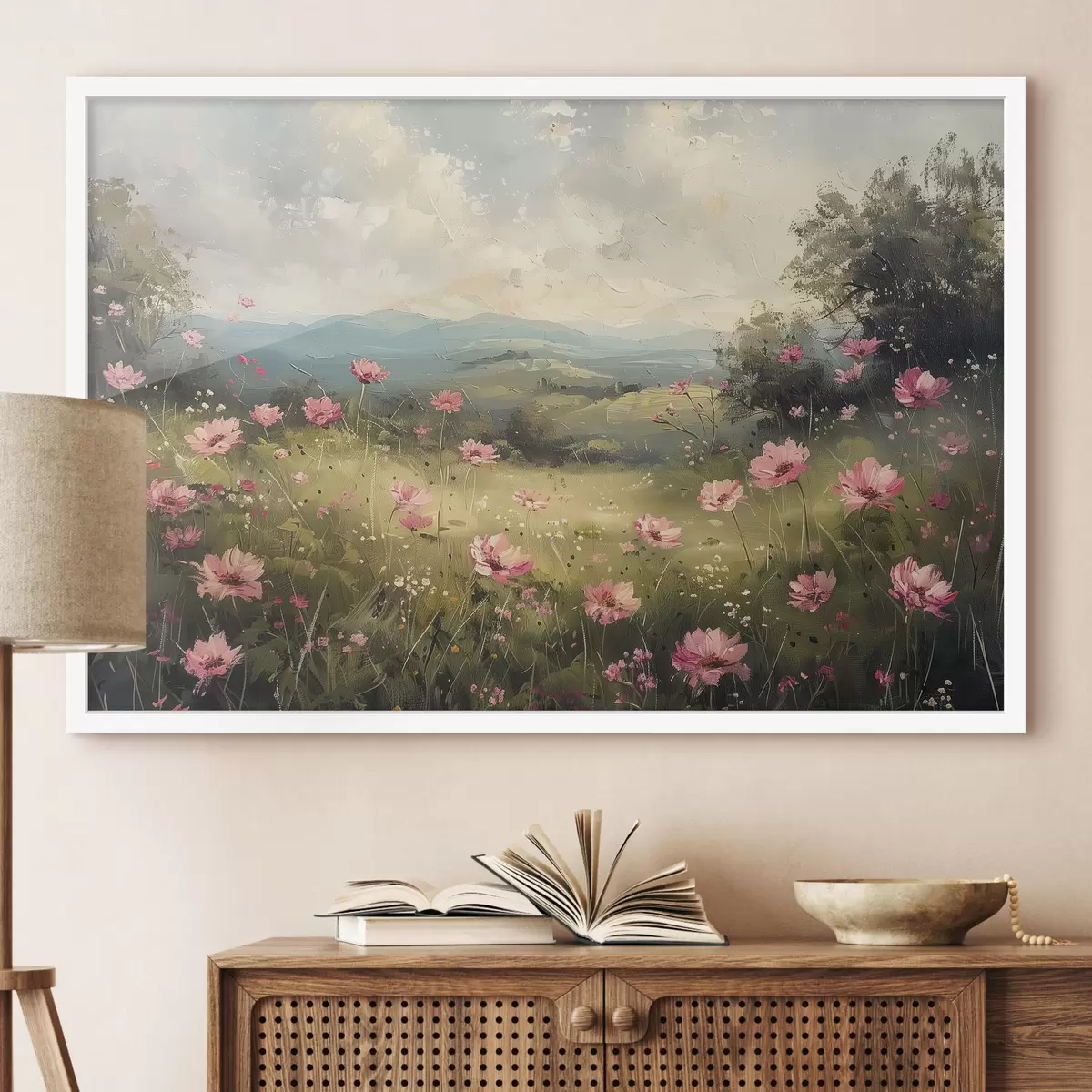 Poster Prato con fiori rosa, erba verde, paesaggio naturale, cielo con nuvole, disegno acrilico Nr f40234