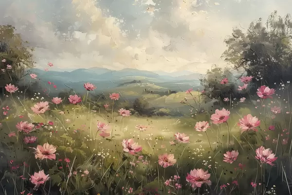 Poster Prato con fiori rosa, erba verde, paesaggio naturale, cielo con nuvole, disegno acrilico Nr f40234