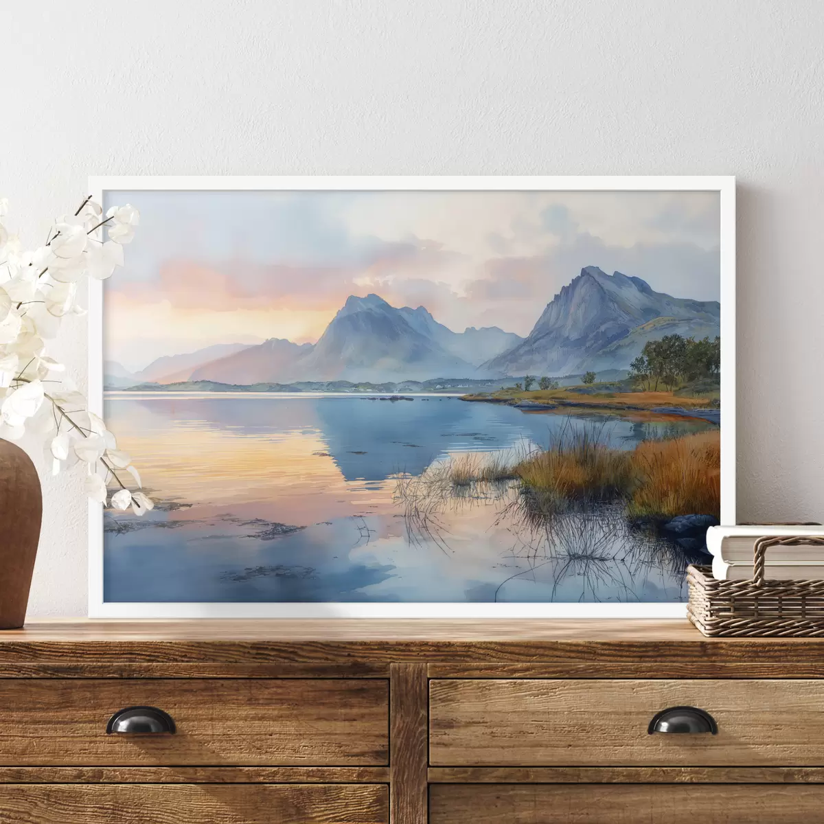 Poster Fiume calmo con montagne, alba, colori tenui f40307