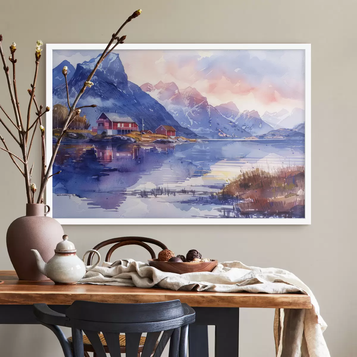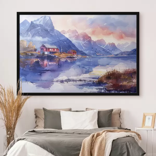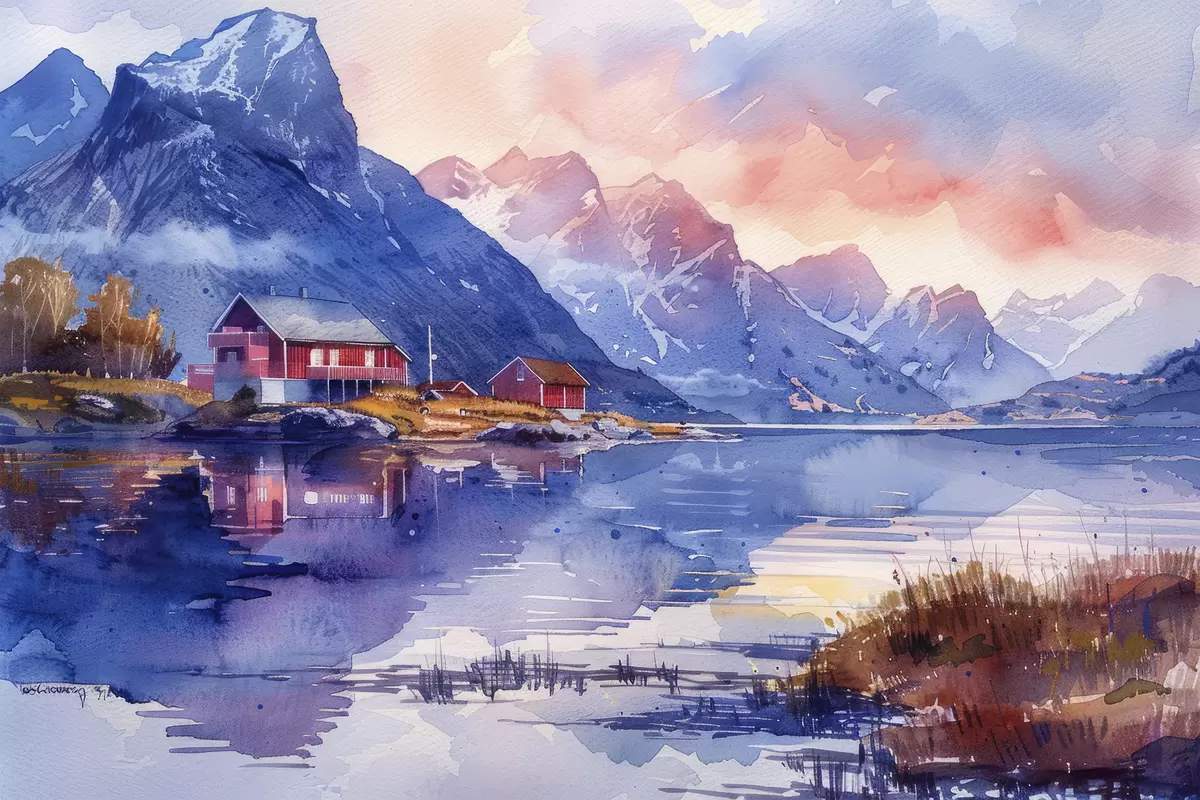Poster Villaggio in Norvegia, cielo al tramonto, fiume calmo, montagne, acquerello Nr f40311