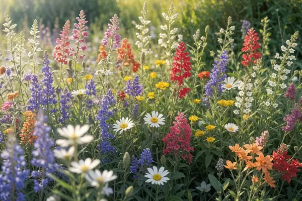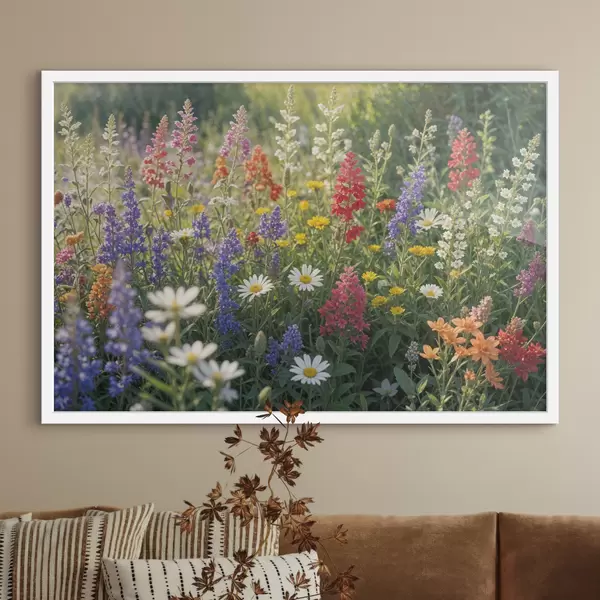 Poster Un prato di fiori selvatici colorati con vari fiori in fiore tra cui margherite, lavanda e fiori rossi Nr f40390