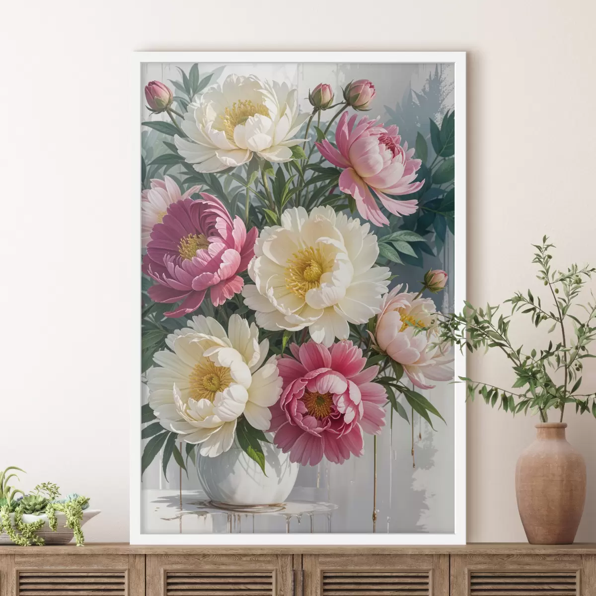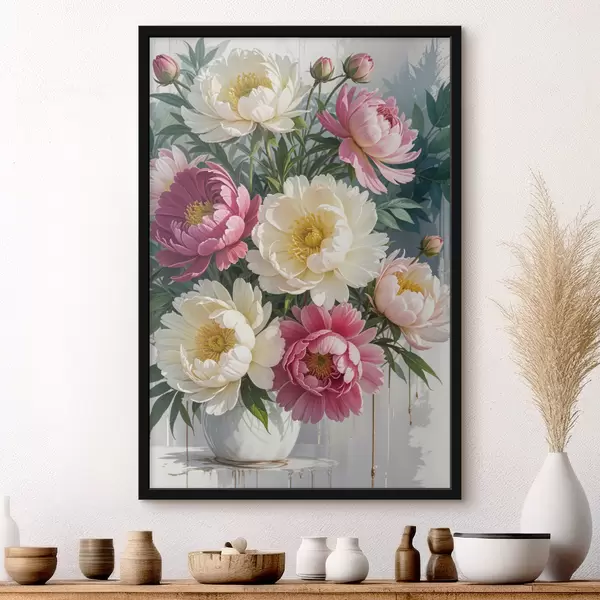 Poster Un bouquet di vivaci fiori di peonia in varie tonalità di rosa, bianco e giallo con schizzi di vernice f40403