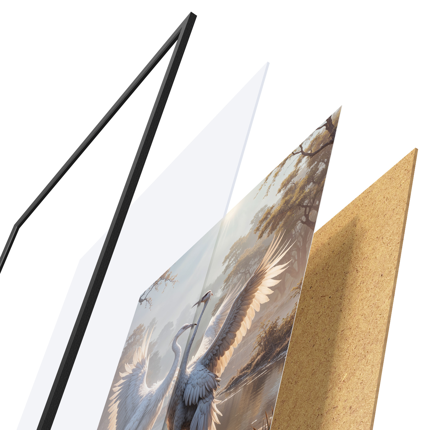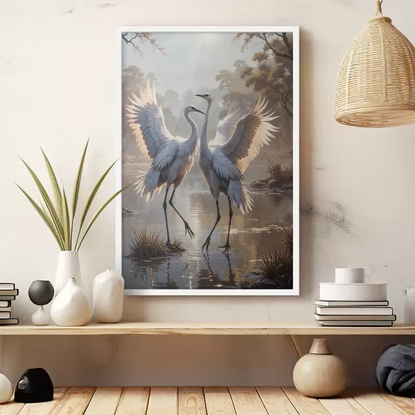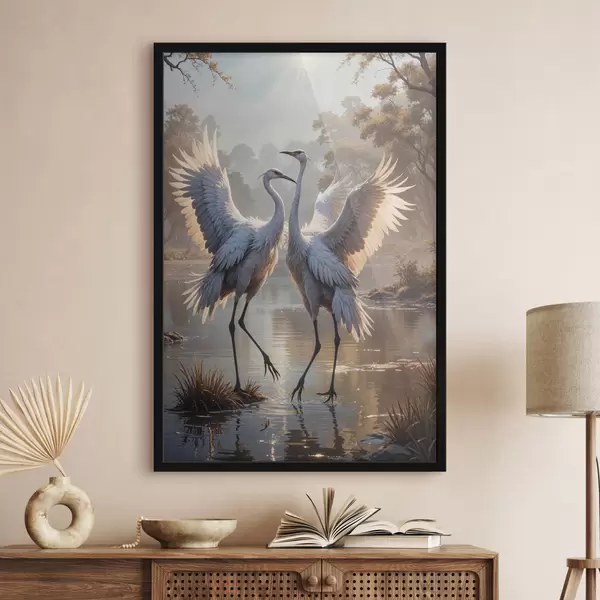 Poster Due grandi gru grigie con lunghi colli e ali spiegate in piedi in un lago nebbioso circondato da alberi Nr f40404