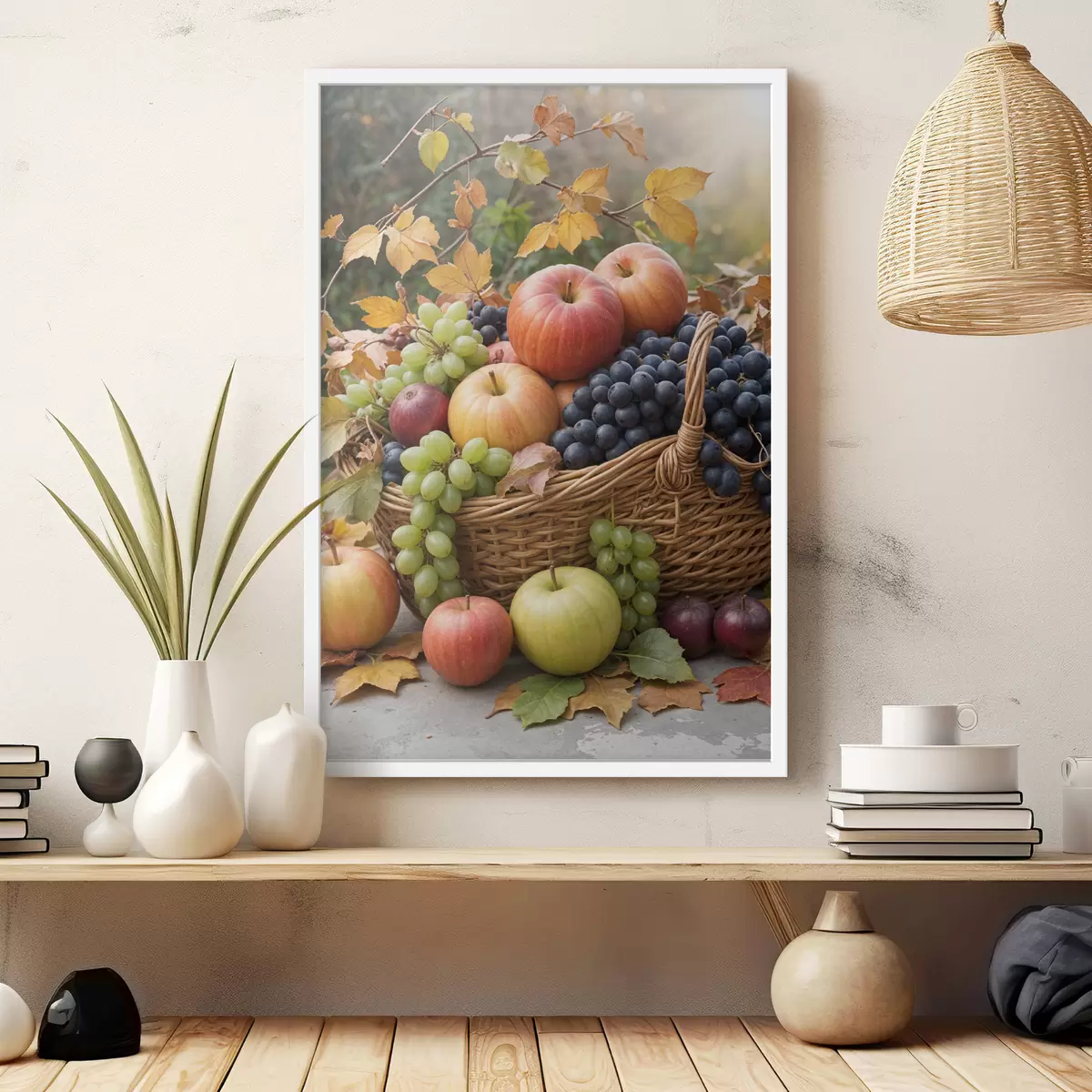 Poster Un cesto pieno di vari frutti autunnali tra cui mele, uva e pere, circondato da foglie cadute Nr f40409