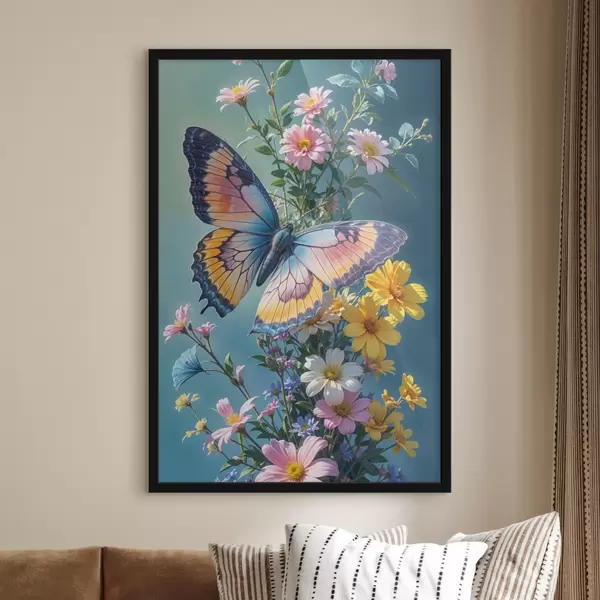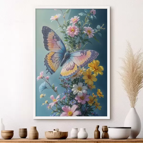 Poster Una grande e colorata farfalla appollaiata su un mazzo di fiori rosa e gialli su uno sfondo verde scuro Nr f40411