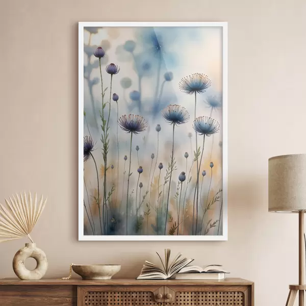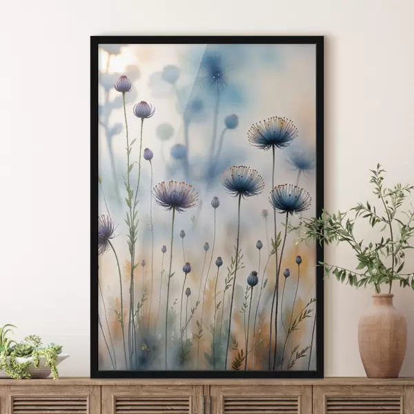 Poster Alti fiori viola simili a denti di leone con sfondo sfocato, che creano un'atmosfera serena e sognante Nr f40414