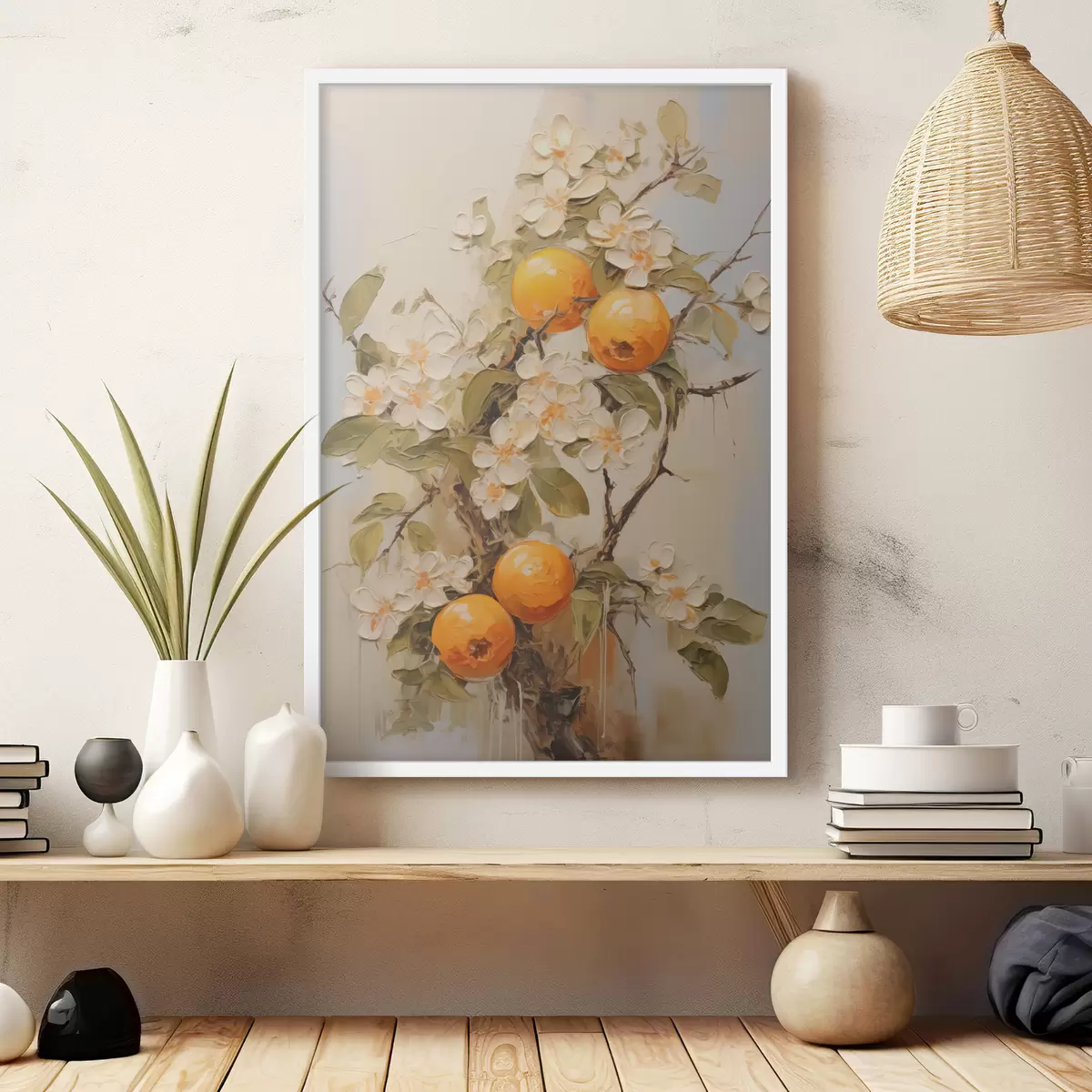 Poster Ramo con fiori bianchi e arance su sfondo grigio-beige Nr f40486