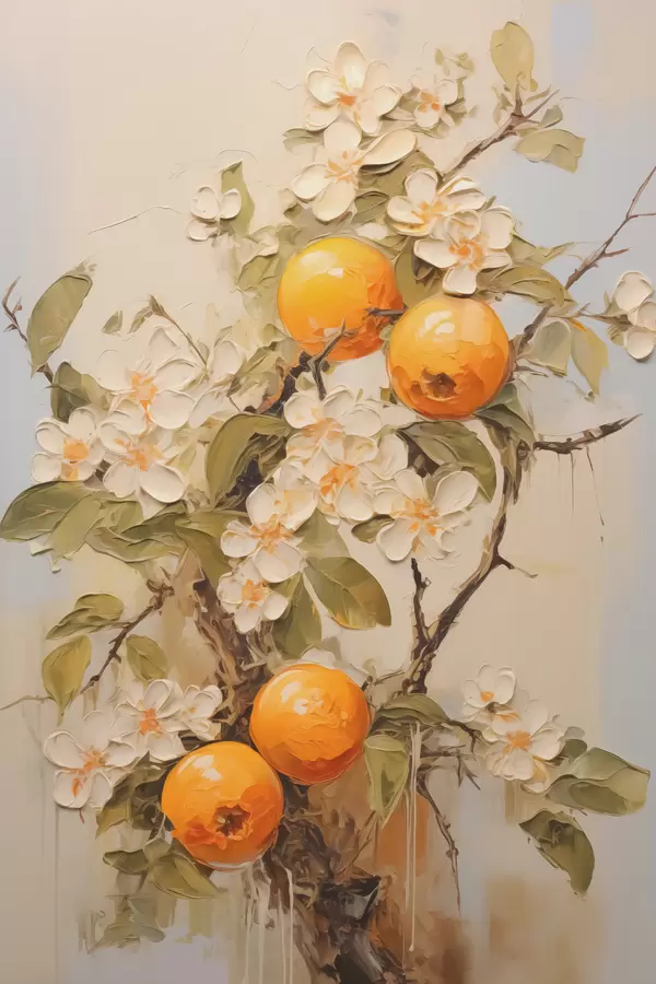 Poster Ramo con fiori bianchi e arance su sfondo grigio-beige f40486