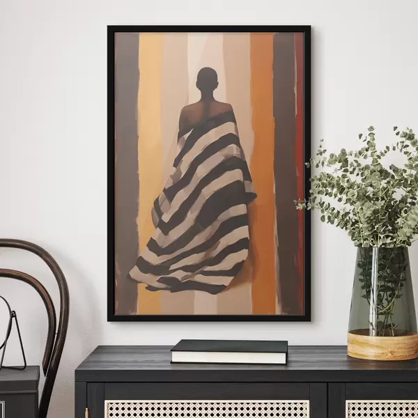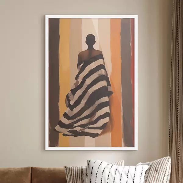Poster Silhouette di una donna afroamericana con mantello a righe su uno sfondo a righe verticali, nero, beige, giallo, rosso, marrone f40487