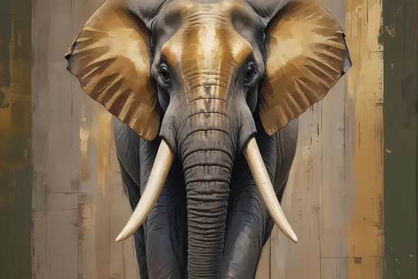 Poster Un grande dipinto di elefante africano strutturato con zanne e orecchie color avorio svasate, su uno sfondo di legno f40544
