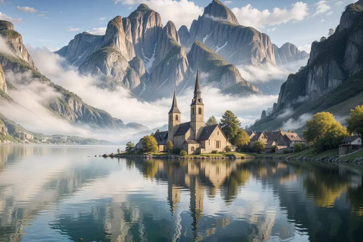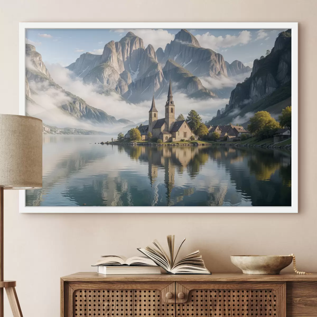 Poster Un pittoresco villaggio alpino adagiato lungo un lago sereno, con imponenti montagne innevate Nr f40554