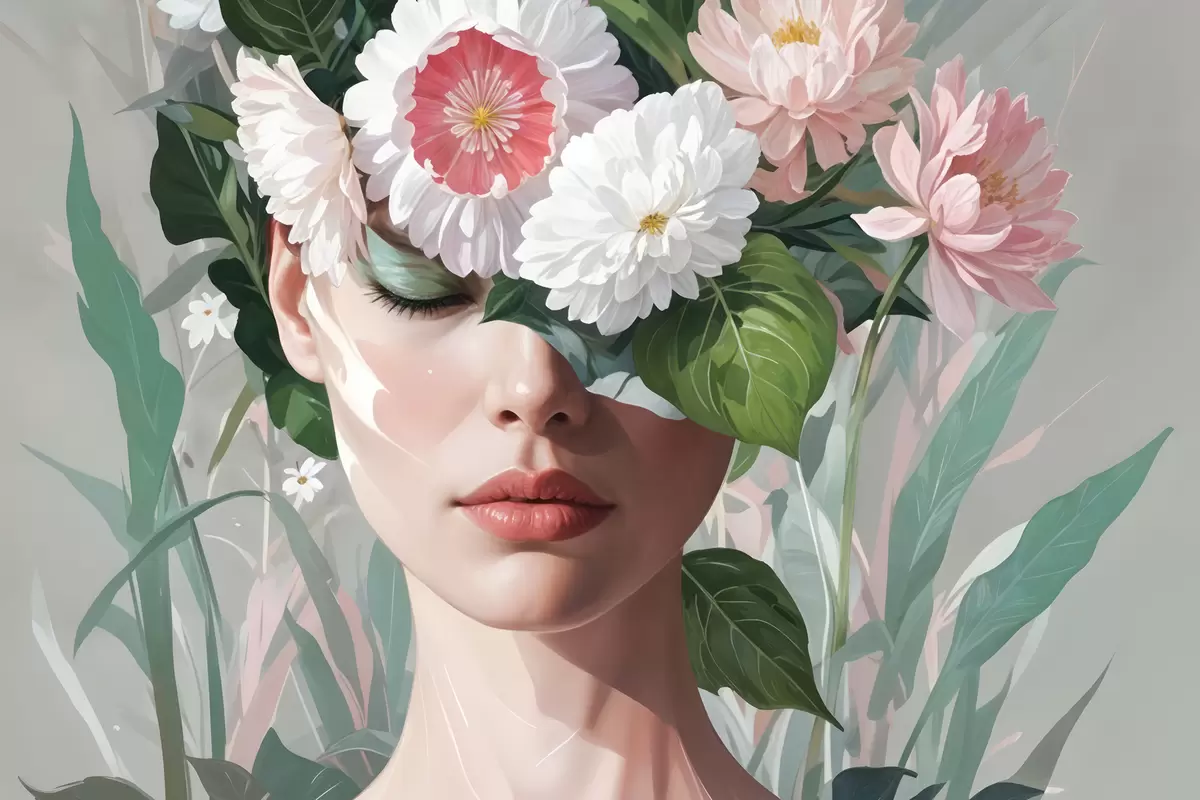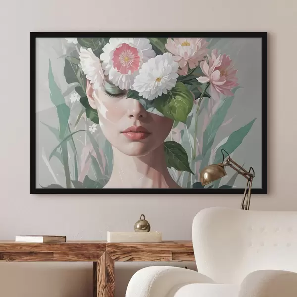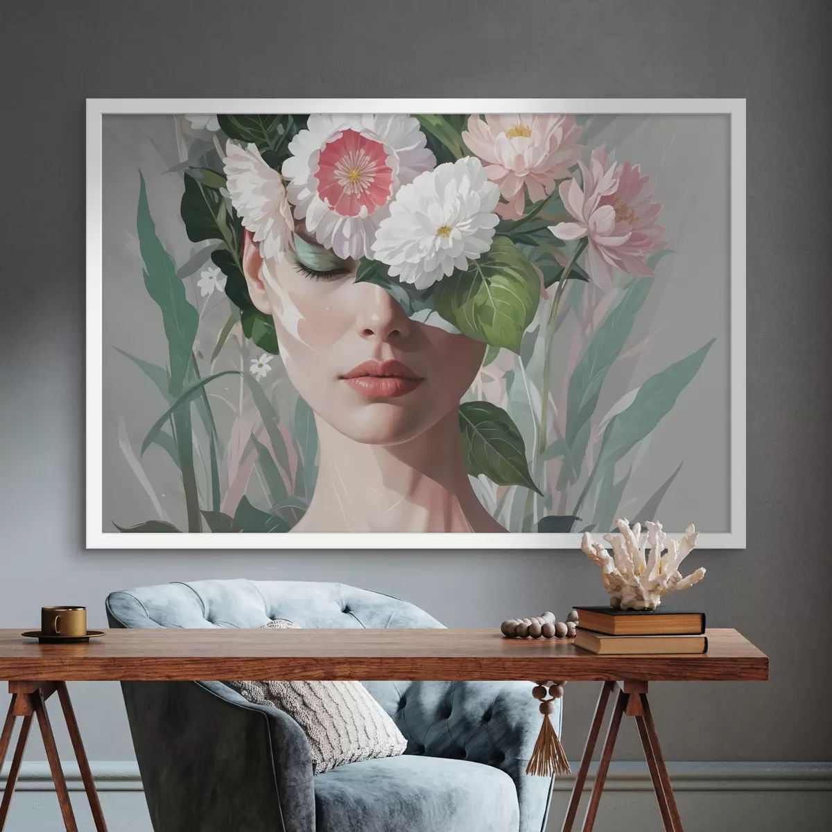 Poster Una donna parzialmente nascosta da un bouquet di grandi fiori rosa e bianchi su uno sfondo verdeggiante e frondoso Nr f40567