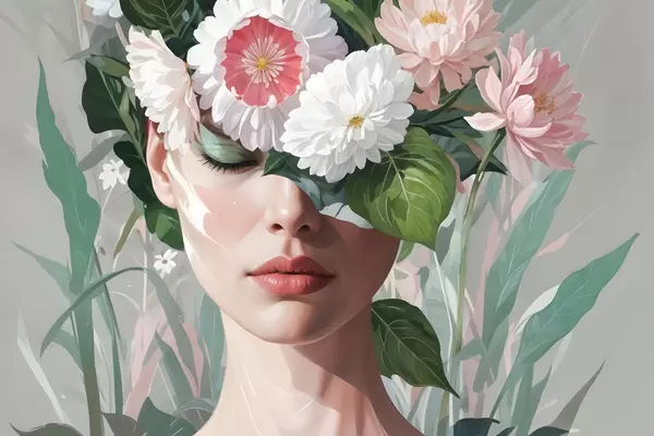Poster Una donna parzialmente nascosta da un bouquet di grandi fiori rosa e bianchi su uno sfondo verdeggiante e frondoso f40567