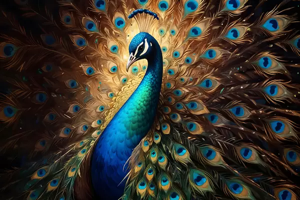 Poster Un pavone vivace con le sue piume completamente esposte, che mette in mostra il suo splendido piumaggio blu, verde f40571