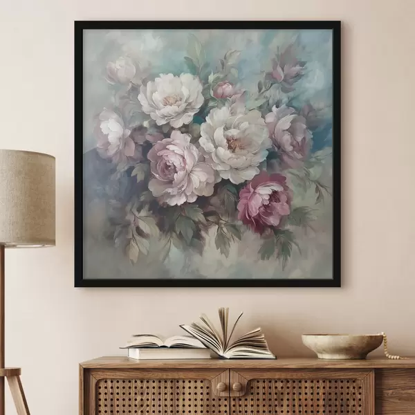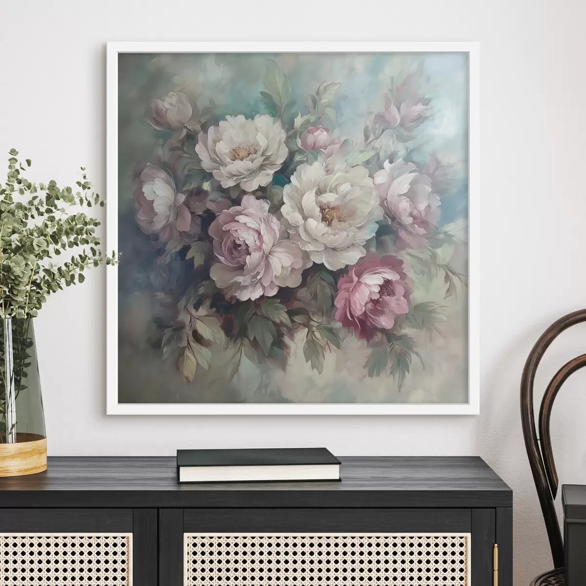 Poster Bouquet di peonie rosa e bianche in pittura ad olio Nr f40582