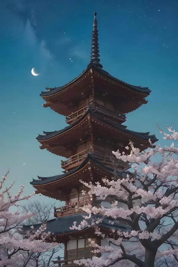 Poster Una pagoda tradizionale giapponese con una luna crescente nel cielo e alberi di ciliegio in fiore f40586