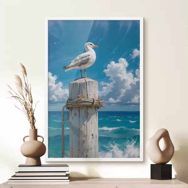 Poster Un gabbiano bianco appollaiato su un palo di legno contro un cielo blu brillante e l'oceano con le onde f40590