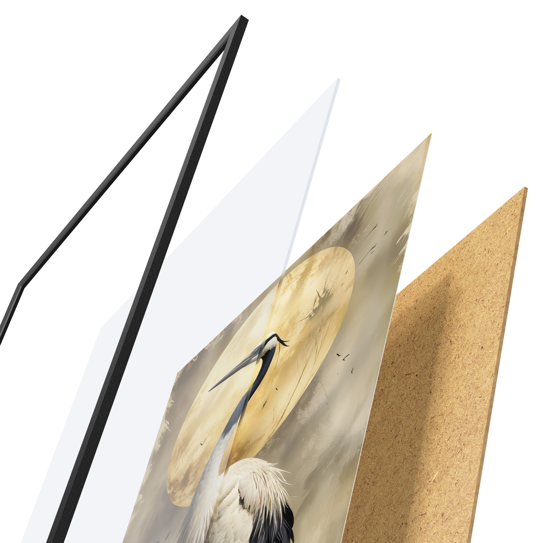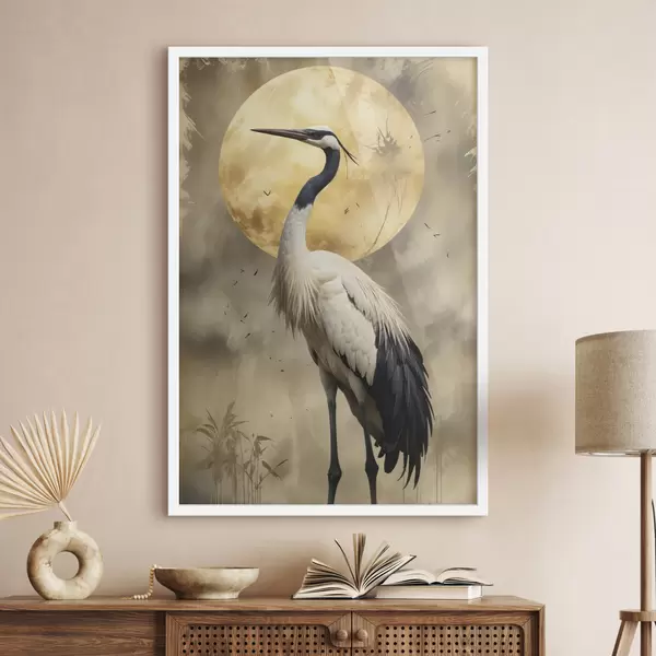 Poster Una maestosa gru grigia in piedi davanti a una grande luna piena, con uno sfondo naturale sfocato f40591