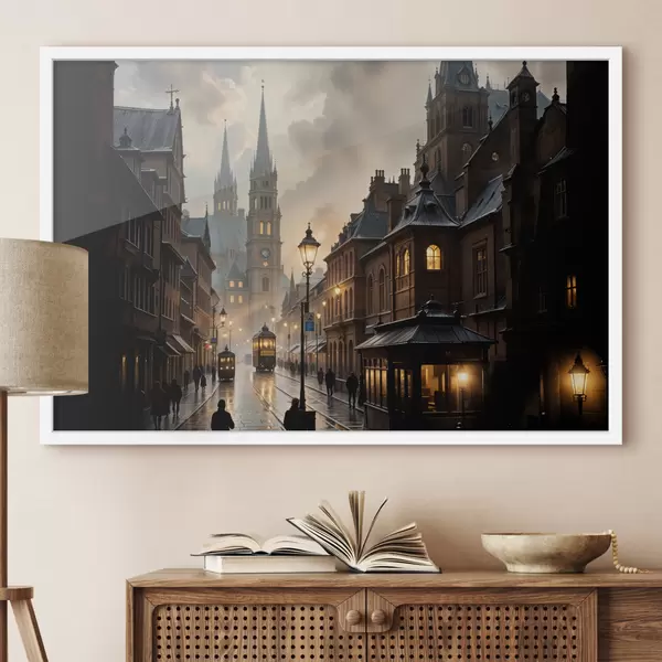 Poster Una serata piovosa in una vecchia città europea, con strade di ciottoli, edifici storici e un tram in transito Nr f40604