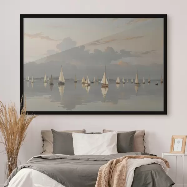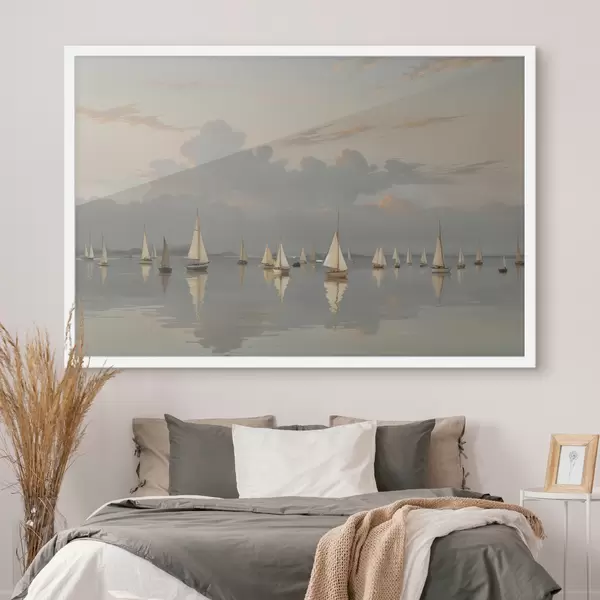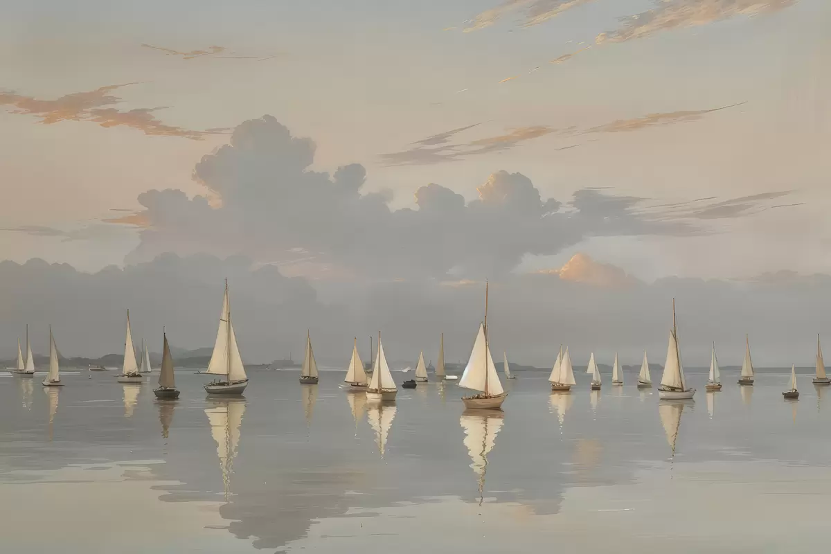 Poster Una flotta di barche a vela bianche su uno specchio d'acqua calmo e riflettente al tramonto, con un cielo nuvoloso sullo sfondo Nr f40615